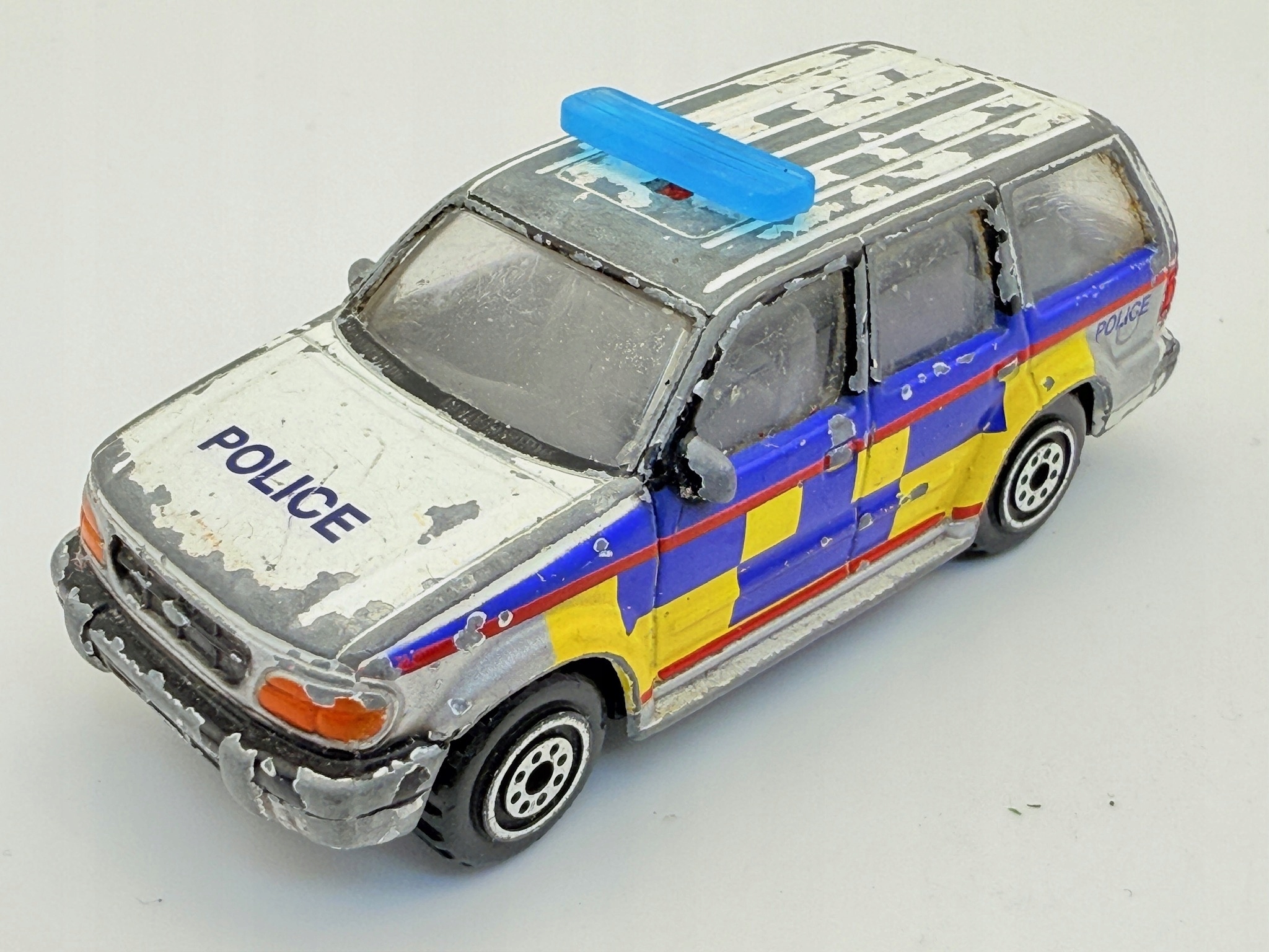 Стійка підвіски Ford Explorer від Realtoy — це модель у масштабі 1:64, яка привертає увагу своїм поліцейським малюнком та аксесуарами, такими як синій півень на даху. Виготовлений з металу, він є ідеальним доповненням до колекції автомобілів уніформених служб.