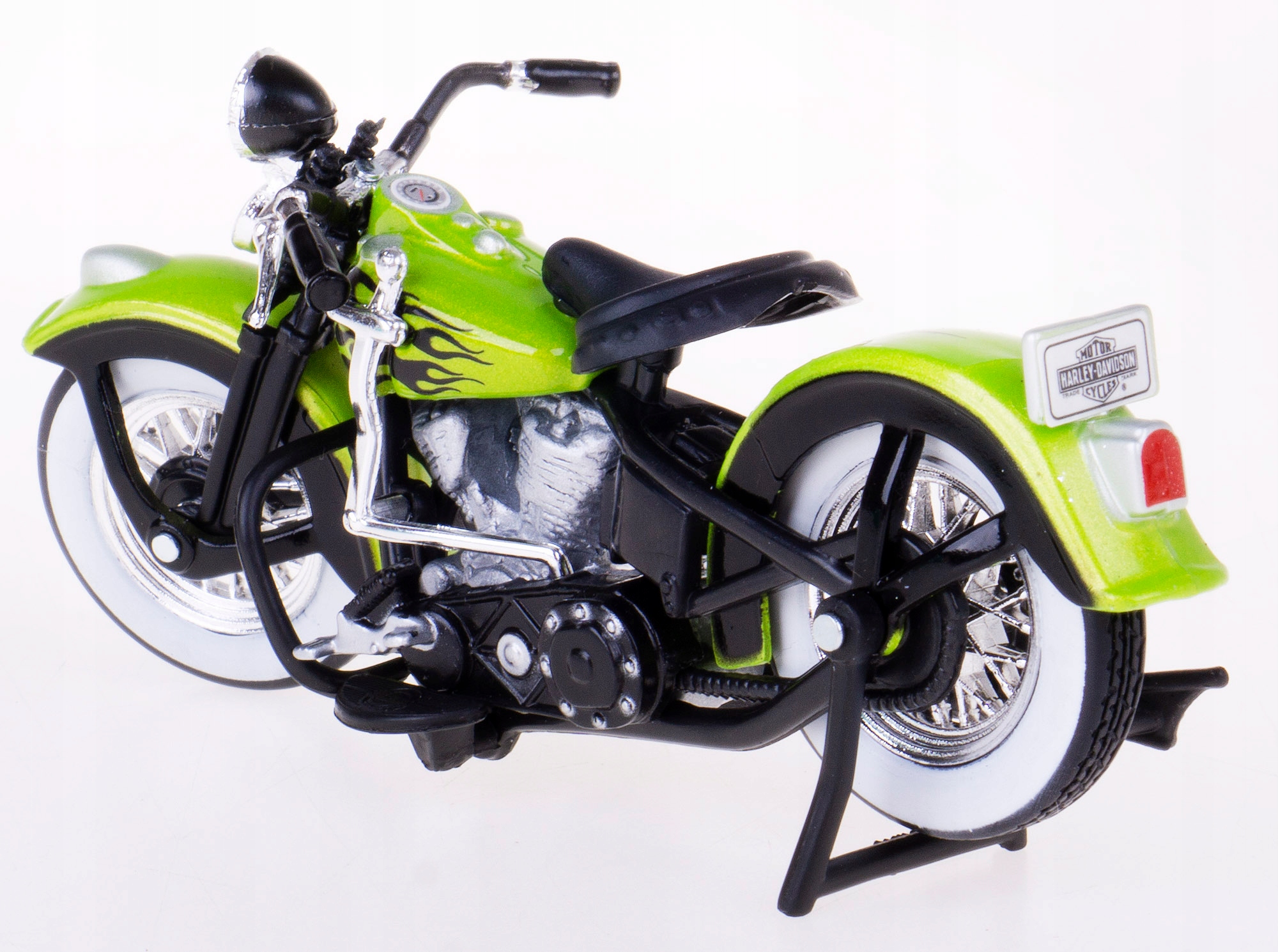 Модель мотоцикла FL PANHEAD виготовлена з пластику та металу з гумовими шинами. Має поворотне кермо, поворотні колеса, гумові шини та рухливу підставку для заднього колеса.