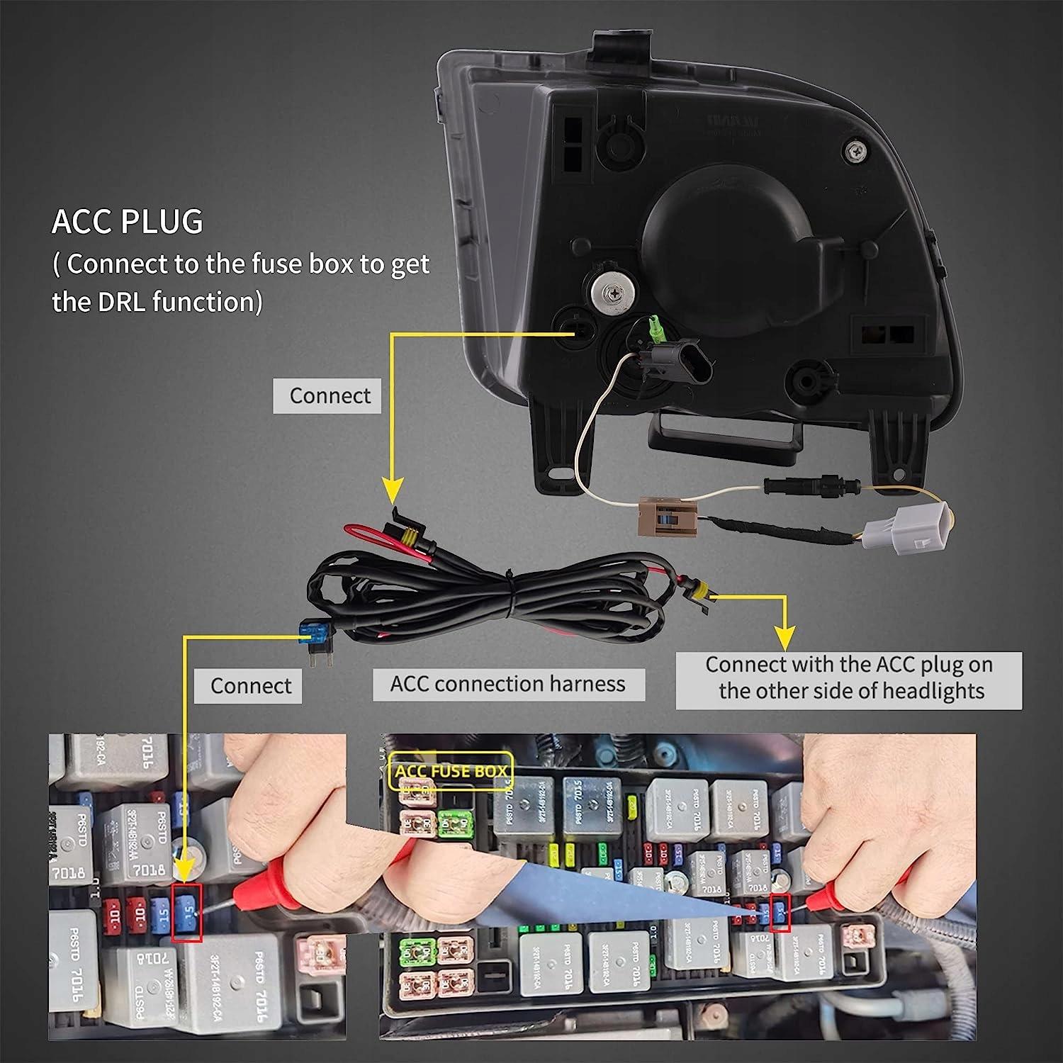 Цей елемент має ті самі з’єднання та дроти, що й оригінальні фари. Його легко встановити (рекомендується професійне встановлення).