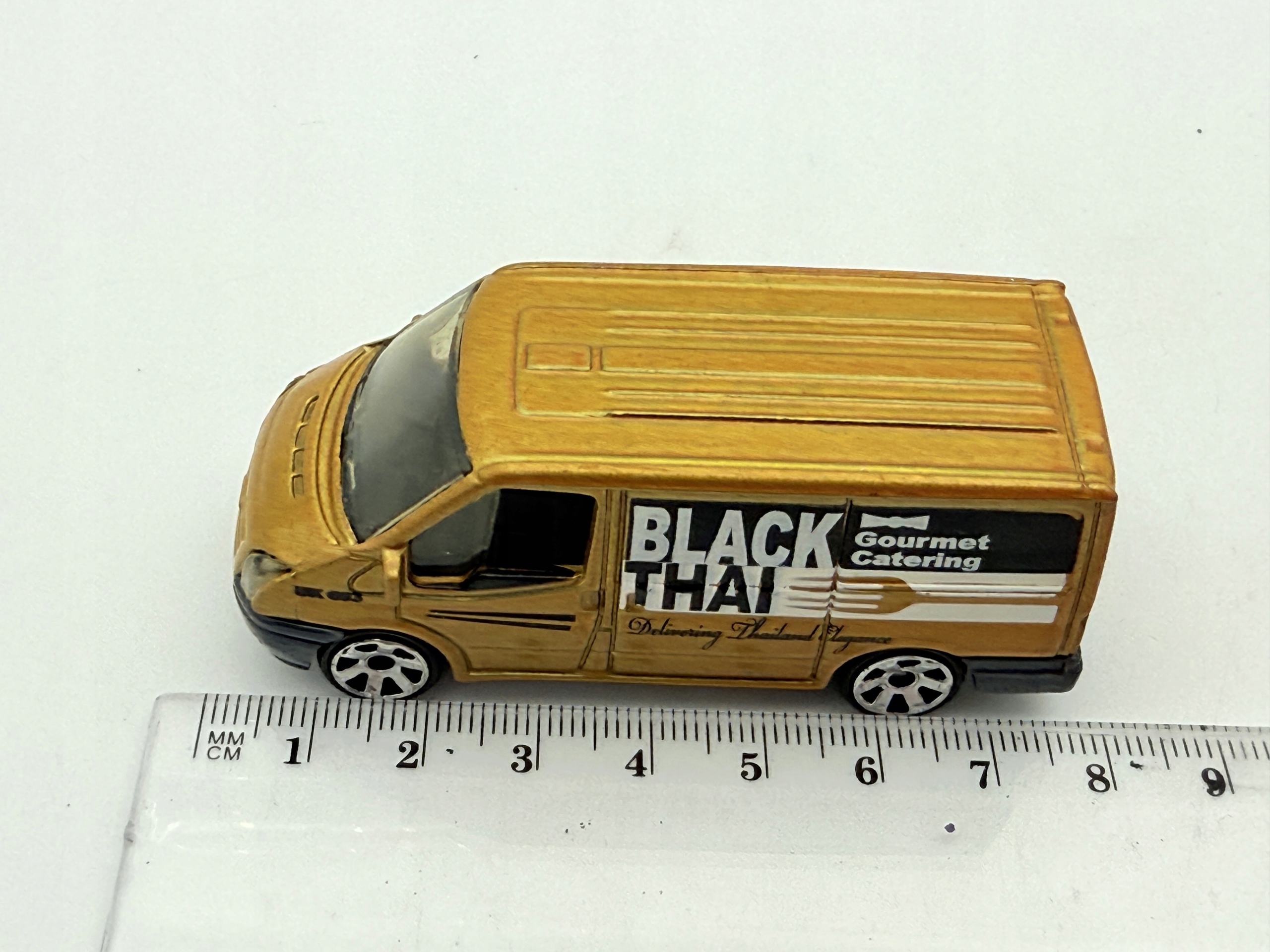 Поговоріть Ford Transit від Matchbox - це модель, яка привертає увагу своєю унікальною золотою живописом та тематичним друком "Чорного тайського гурманського харчування". Ця модель, виготовлена з металевого корпусу з пластиковими елементами, є твердою та міцною. Такі деталі, як спортивні диски та точно зроблені відбитки, підкреслюють його унікальний характер. Хоча деякі ознаки використання можна побачити, весна зберігає свою чарівність і буде привабливим доповненням до будь -якої колекції. Ідеально підходить для шанувальників міських комерційних транспортних засобів, ця модель представляє сучасний дизайн та практичність Ford Transit.
