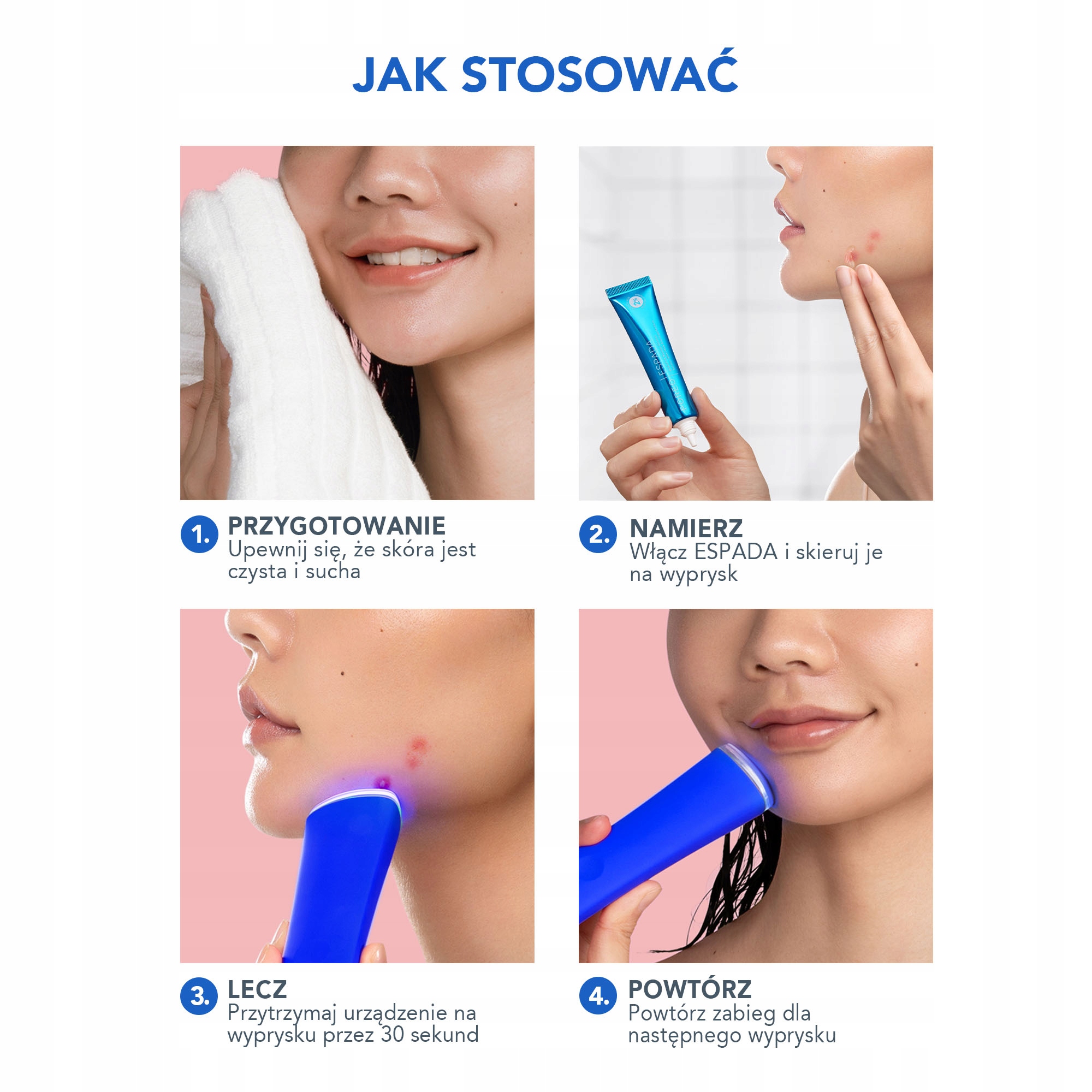 • Для найкращих результатів продукту ESPADA™ BHA+PHA використовуйте за допомогою приладу і повторюйте процедуру вранці та ввечері до повного зникнення прищів