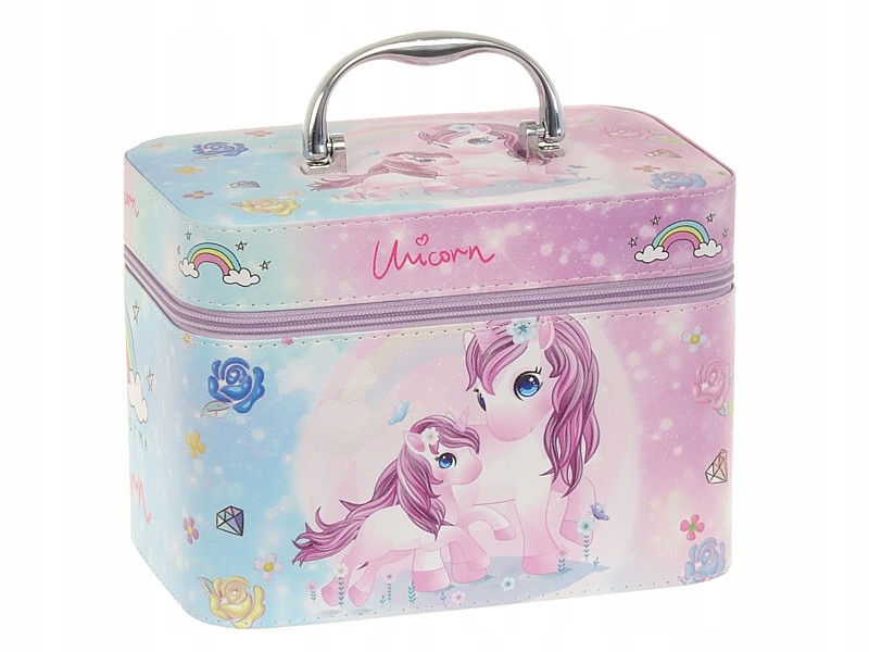 Коробка, виготовлена з особливою ретельністю, має одне просторе відділення, обшите тканиною. Закривається на блискавку з декоративною ручкою. У відкритому вигляді у верхній частині є дзеркало. Ідеально підходить для зберігання першої дівочої косметики. Його також можна використовувати як місце для зберігання шкільного приладдя та інших дрібниць. Завдяки зручній металевій ручці ваша дитина зможе взяти свою косметичку куди завгодно.
