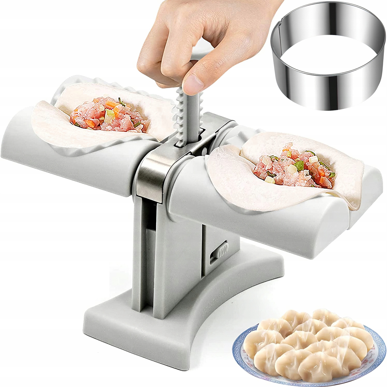 - Конструкція з подвійною головкою дозволяє нам загортати два пельмені одночасно, швидше та ефективніше, ніж робити вареники вручну.