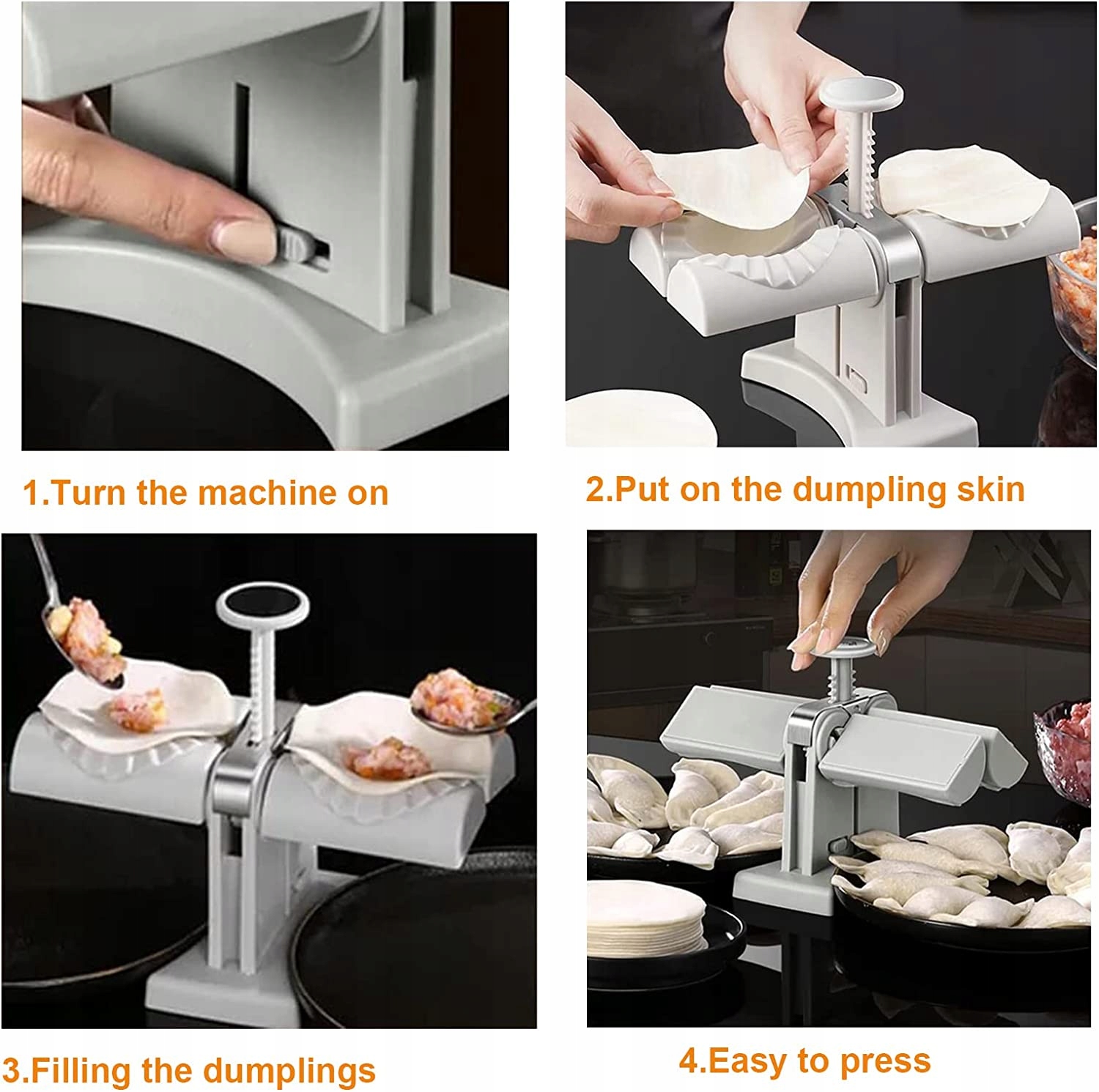 Користуватися ним дуже легко будь-кому. Спочатку посипте трохи борошна, щоб запобігти прилипанню, а потім покладіть упаковку для вареників на машину. Нарешті натисніть, щоб зробити вареники. Загорніть по два за раз, щоб швидко наліпити вареники, і початківці швидко навчиться готувати красиві вареники. Пельменні шкірки щільно прилягають і не розкриваються під час варіння!