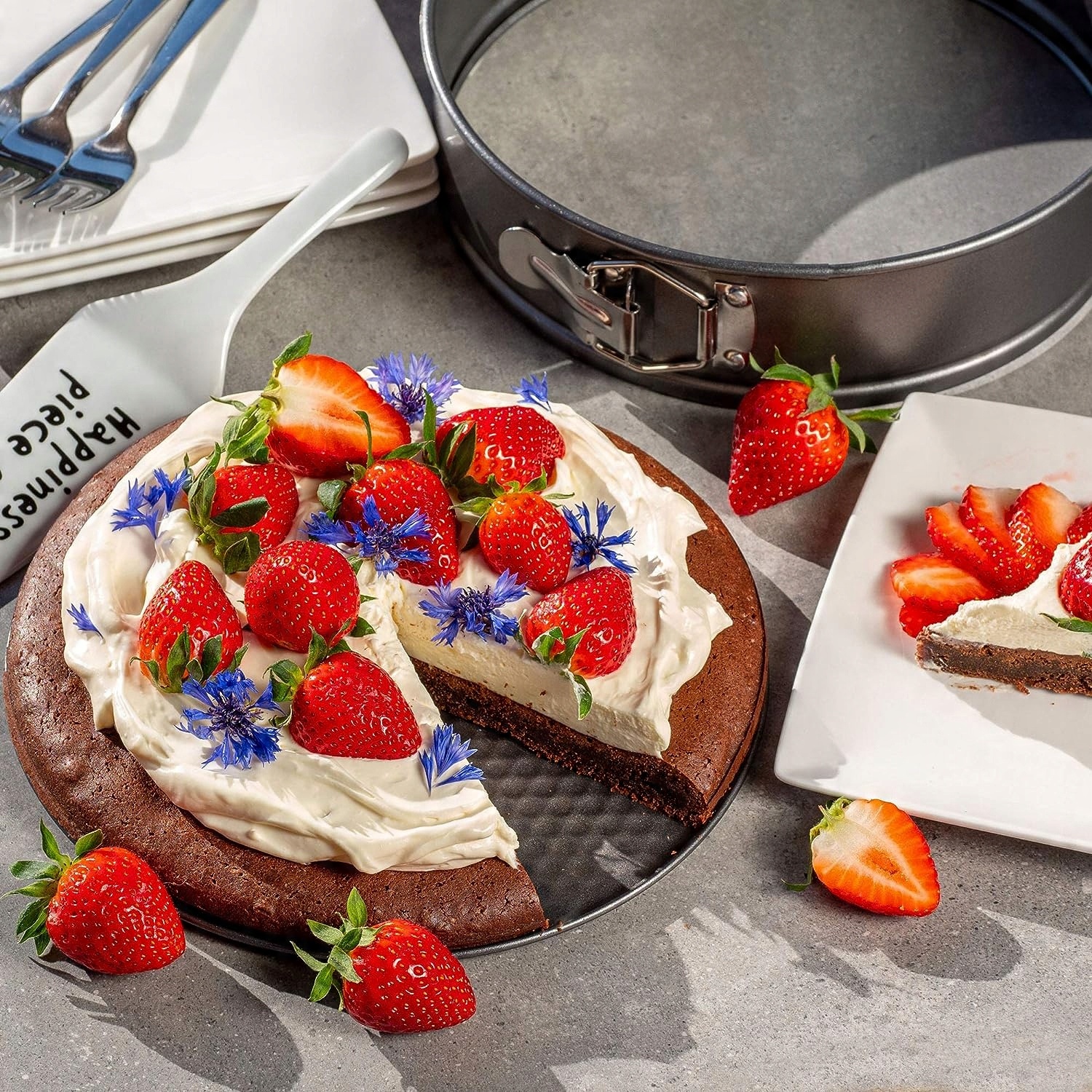 Затискач, який використовується для кріплення бортів, простий у використанні та ефективно утримує торт. . Знімне дно з успіхом можна використовувати для подачі випічки до столу. Міцне деко, з якого виготовлені форми для випічки, покрито антипригарним шаром. Форми для випікання зі знімними бортиками ідеально підходять для випікання коржів і тортів.