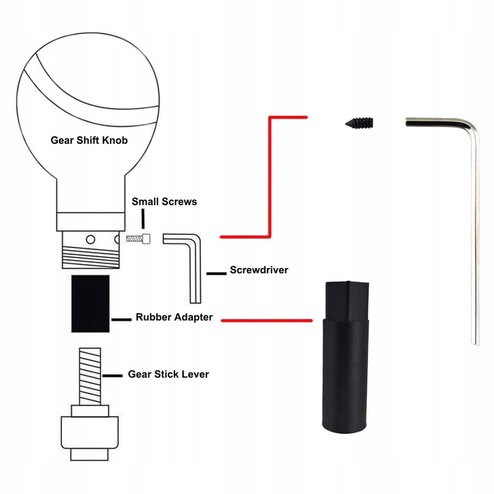 5. Легко встановити: доступні кілька адаптерів, просто вийміть оригінальну головку ручки перемикання, виберіть відповідний гумовий рукав, потім обертайте до монтажу на перемикач і, нарешті, затягніть його шестигранним гайком.