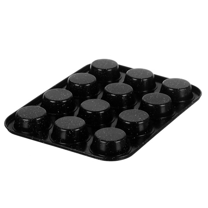 Форма на 12 отворів для приготування смачних кексів і мафінів. Виготовлена з вуглецевої сталі, покрита спеціальним антипригарним покриттям, яке полегшує випікання та зберігає її чистою.