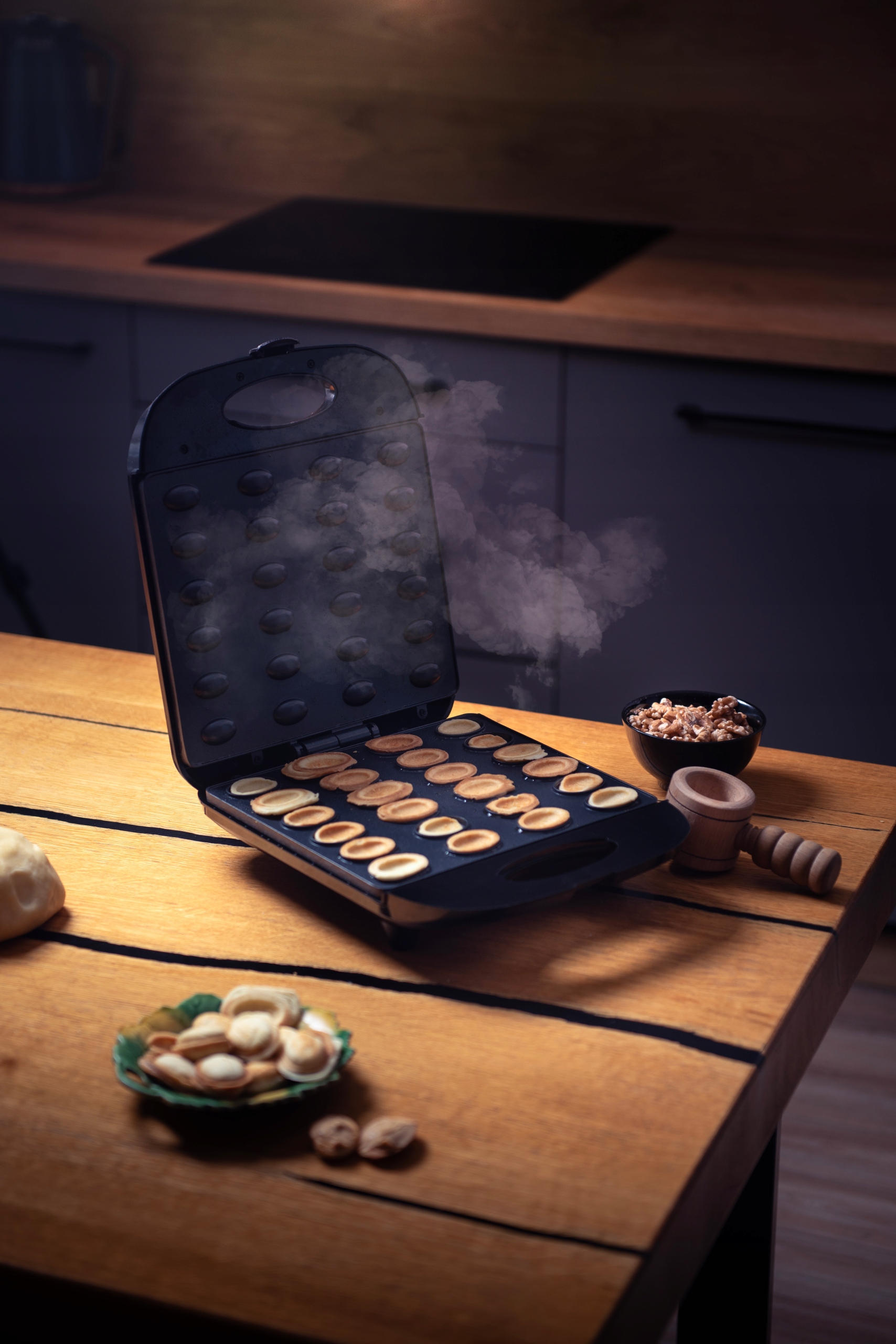 Наш пристрій для випічки печива у вигляді горіхів, наповнених вершками , швидко готує 24 половинки з одним циклом смаження .