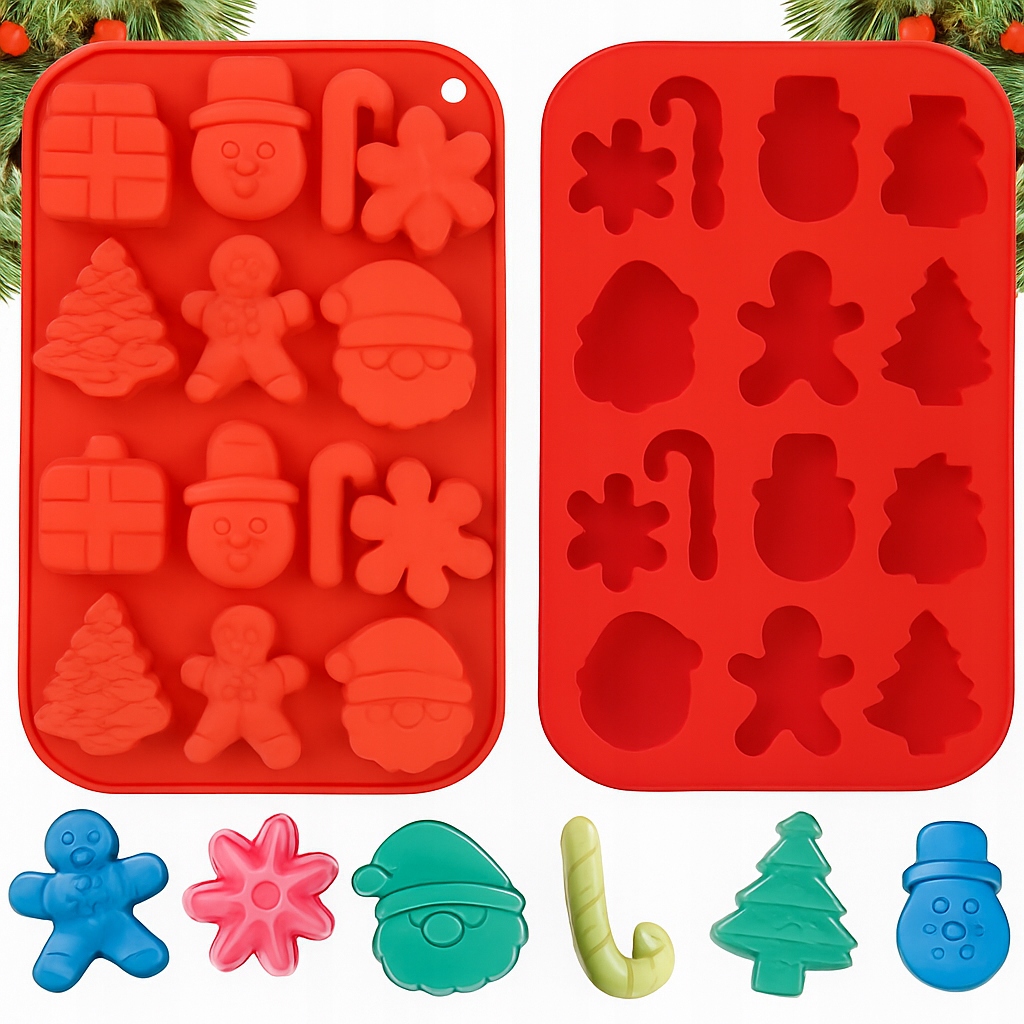 Силіконова форма з різдвяними візерункамидля виготовлення домашніх шоколадних цукерок та цукерок з поглибленнями у формі: лцукерок, сніговиків, подарунків, ялинок, шкарпеток та голови Діда Мороза. Також виріб призначений для створення желе або кубиків льоду.
