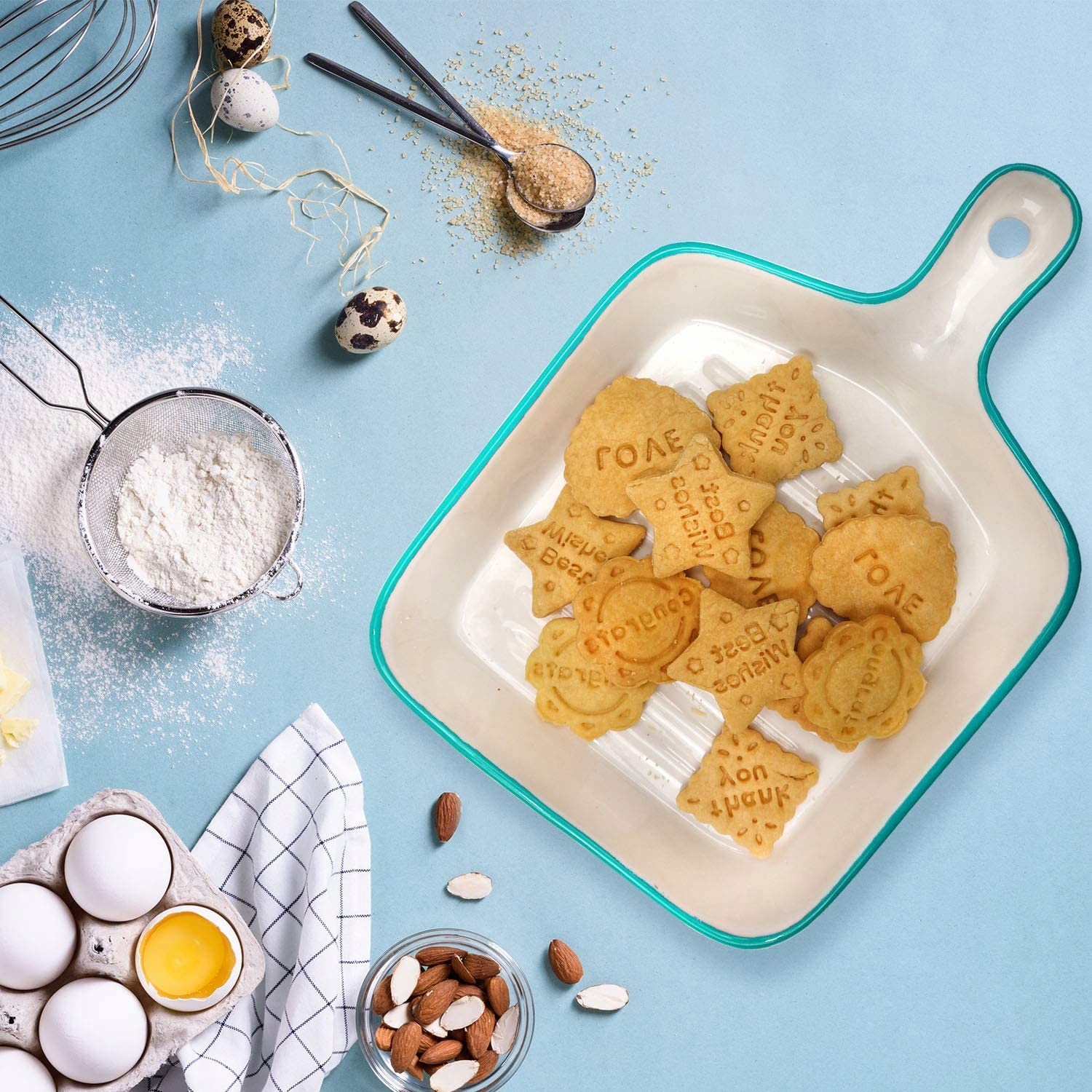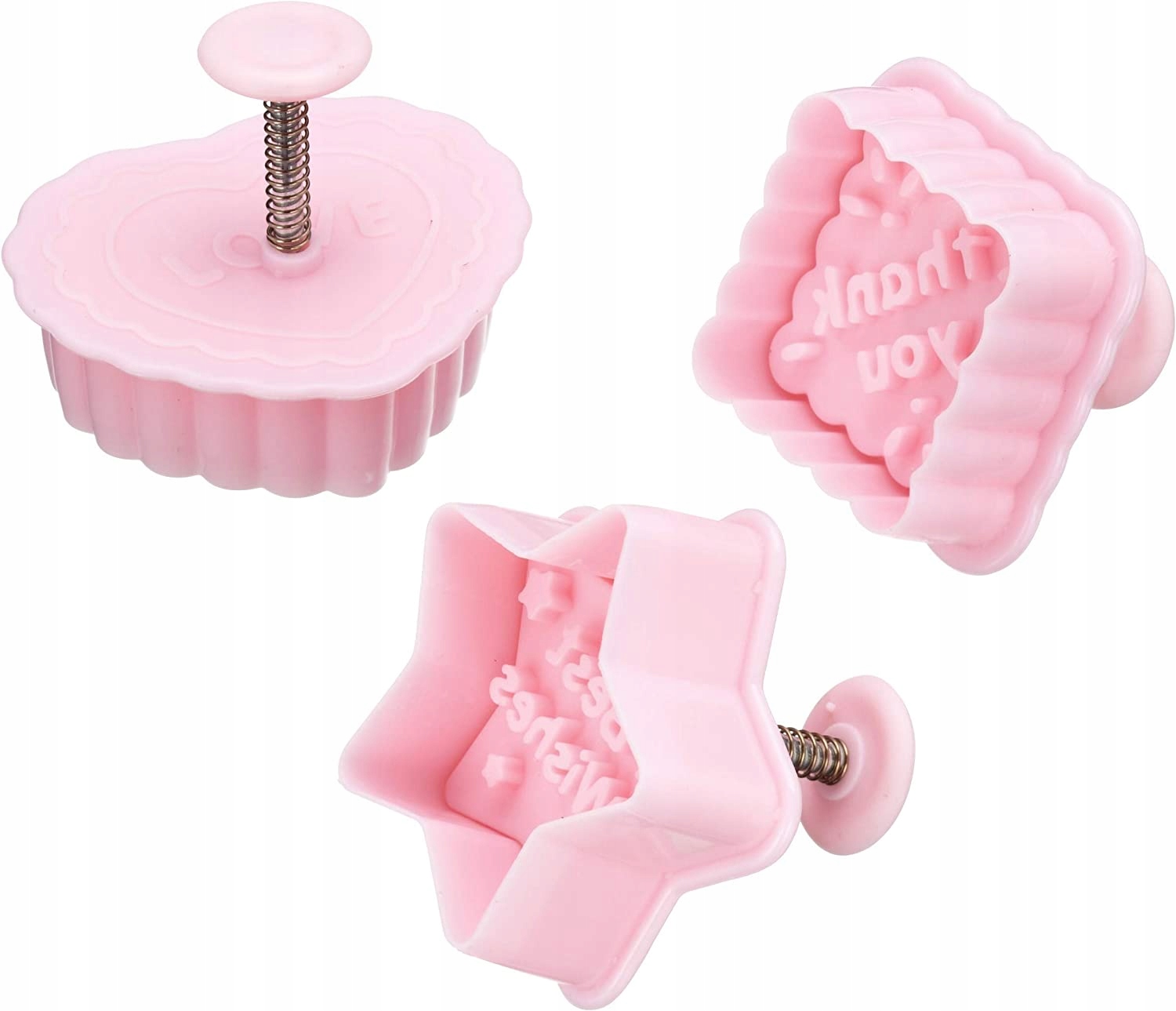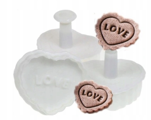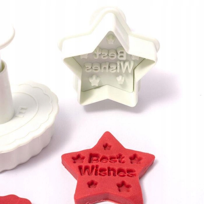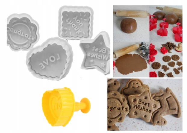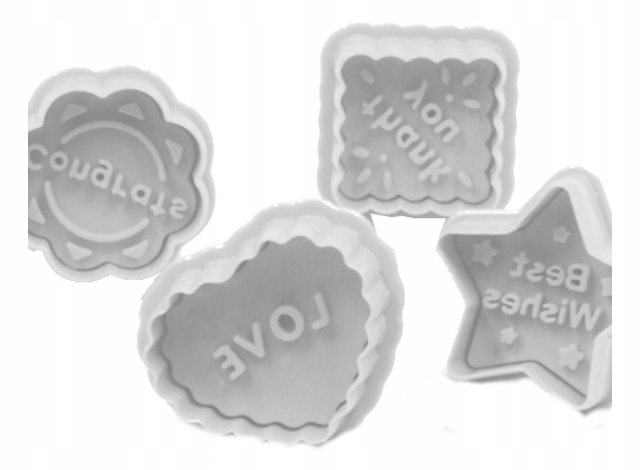 Красиві, білі штампи-різці з різними візерунками. На штампах зображені найпопулярніші візерунки, які використовуються для вирізання печива. Щоб легше було знайти потрібний різак, у верхній частині є напис, яким натискаємо на печиво.