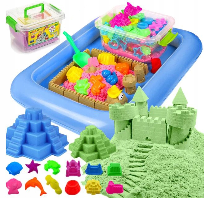 Гра в місцевій пісочниці – це те, що запам’ятається на довгі роки. Коли погода не сприяє виходу на вулицю, можна створити дитячий майданчик вдома. Все, що вам потрібно, це шматок місця для басейну, наповненого піском. Набір дозволить вам будувати різноманітні споруди, відображати тварин і створювати власні варіації та пейзажі. Цей пісок м’який, гнучкий і водночас надзвичайно стійкий, що не завадить вам будувати великі вежі.