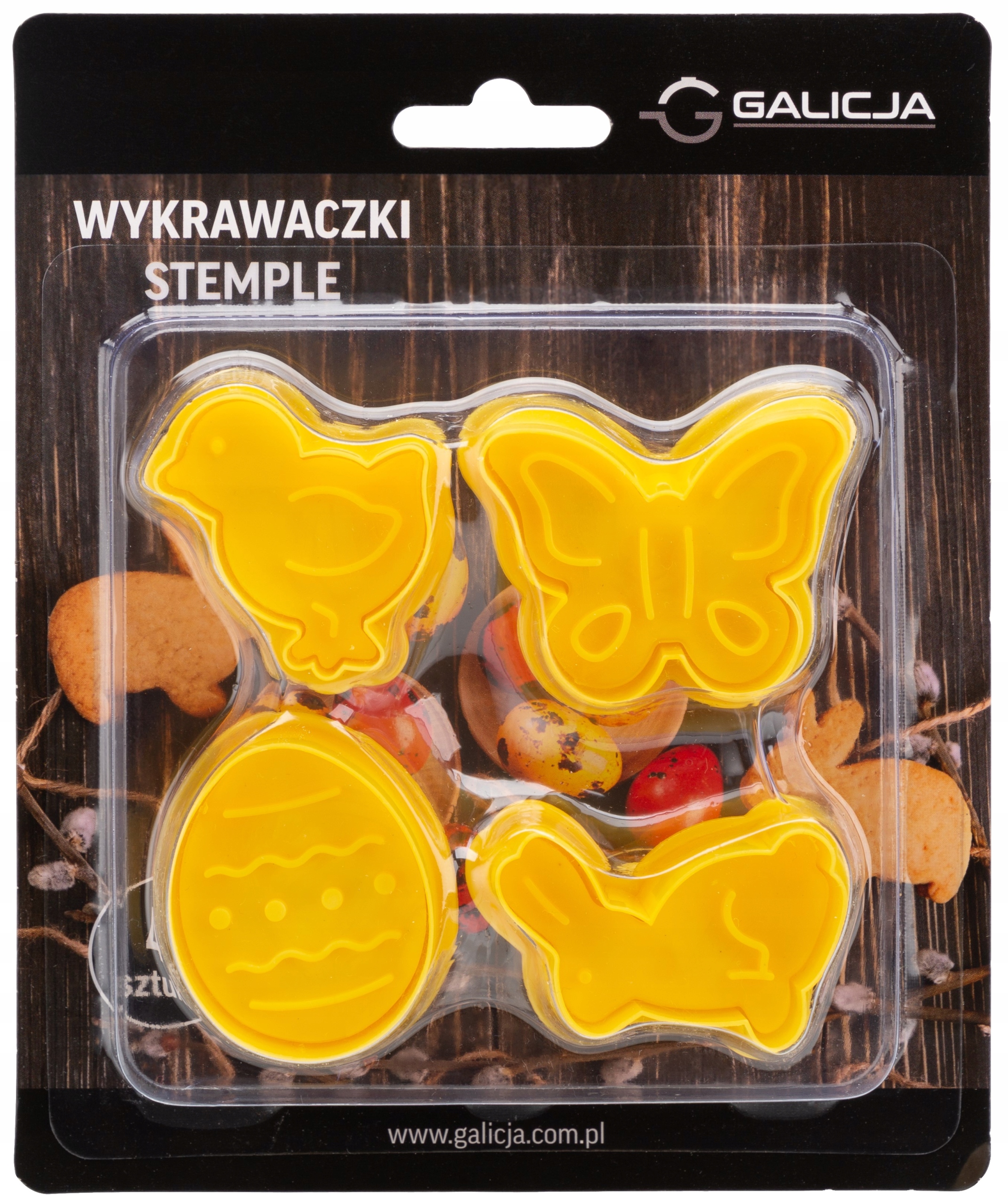 Набір штемпельників торгової марки Galicja з пластику. У наборі чотири кубики: курча, яйце, метелик і зайчик. Приготувати печиво дуже просто - просто поставте форму на тісто і натисніть на поршень, завдяки пружинному механізму ми створимо ідеальний візерунок з прикрасами. Особливість цих форм в тому, що вони одночасно виконують функцію форми і штампа.
