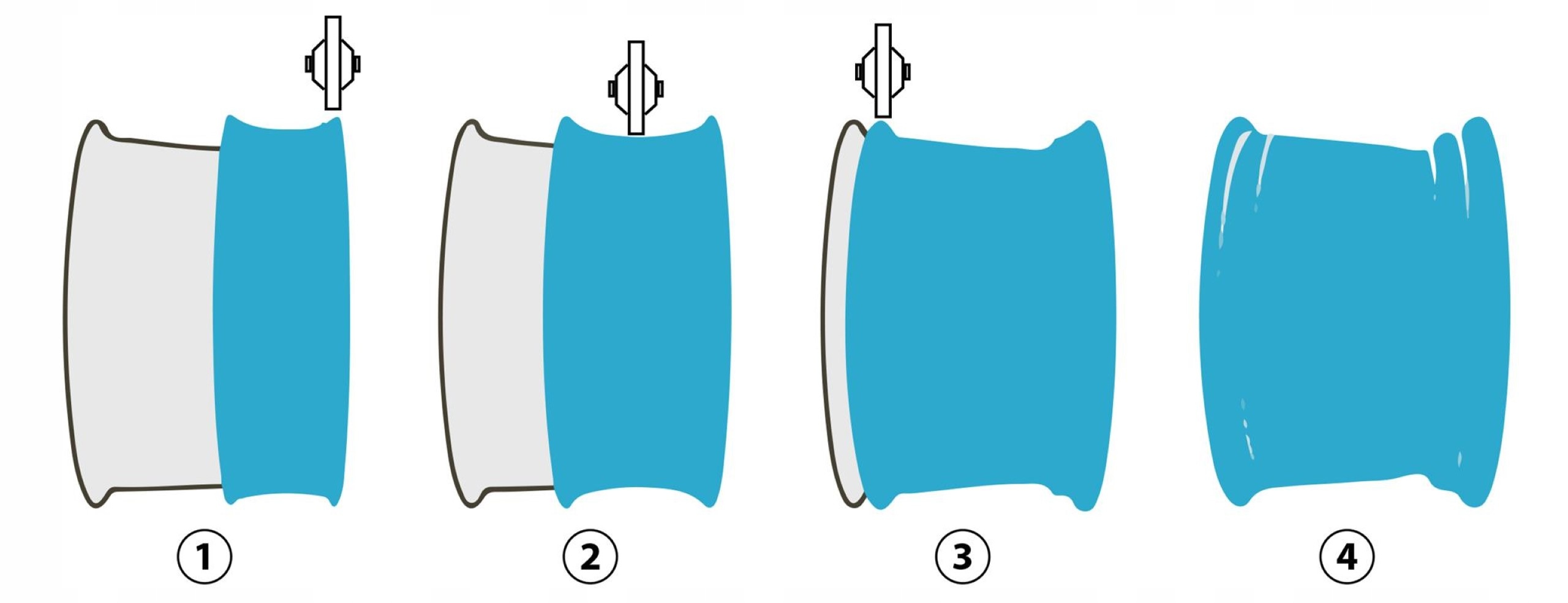 Формування потоку, також відоме як "кування потоку" або "ротаційне кування", - це вдосконалена техніка для виробництва алюмінієвих ободів, що поєднує в собі кування та кочення елементи, щоб отримати світло, але надзвичайно міцні диски. Ось етапи виробничого процесу: