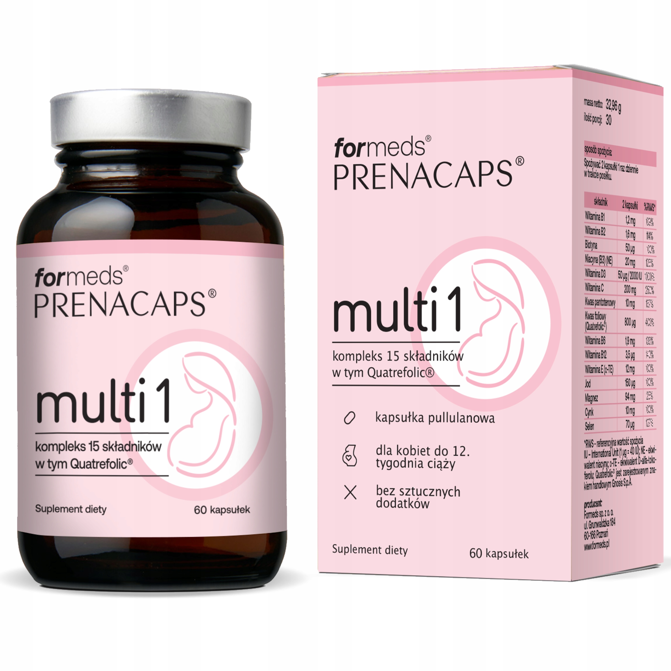 prenacaps multi 1 - комплекс вітамінів і мінералів, призначені для жінок до 12 -го тижня вагітності. Продукт містить високозбалену та активну форми інгредієнтів (включаючи цинкові цитрати, L-selenometionine, метилкобаламін). Він також включає біологічно активну форму фолієвої кислоти (Quatrefolic®), з високою біодоступністю, доведеною тестами.