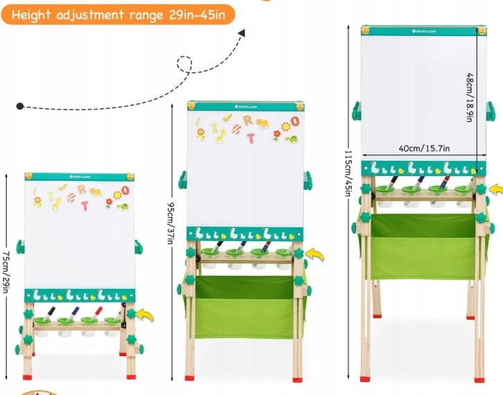 - Регульована висота: мольберт можна регулювати на різну висоту залежно від зростання дитини. Діапазон регулювання висоти мольберта 74-124 см