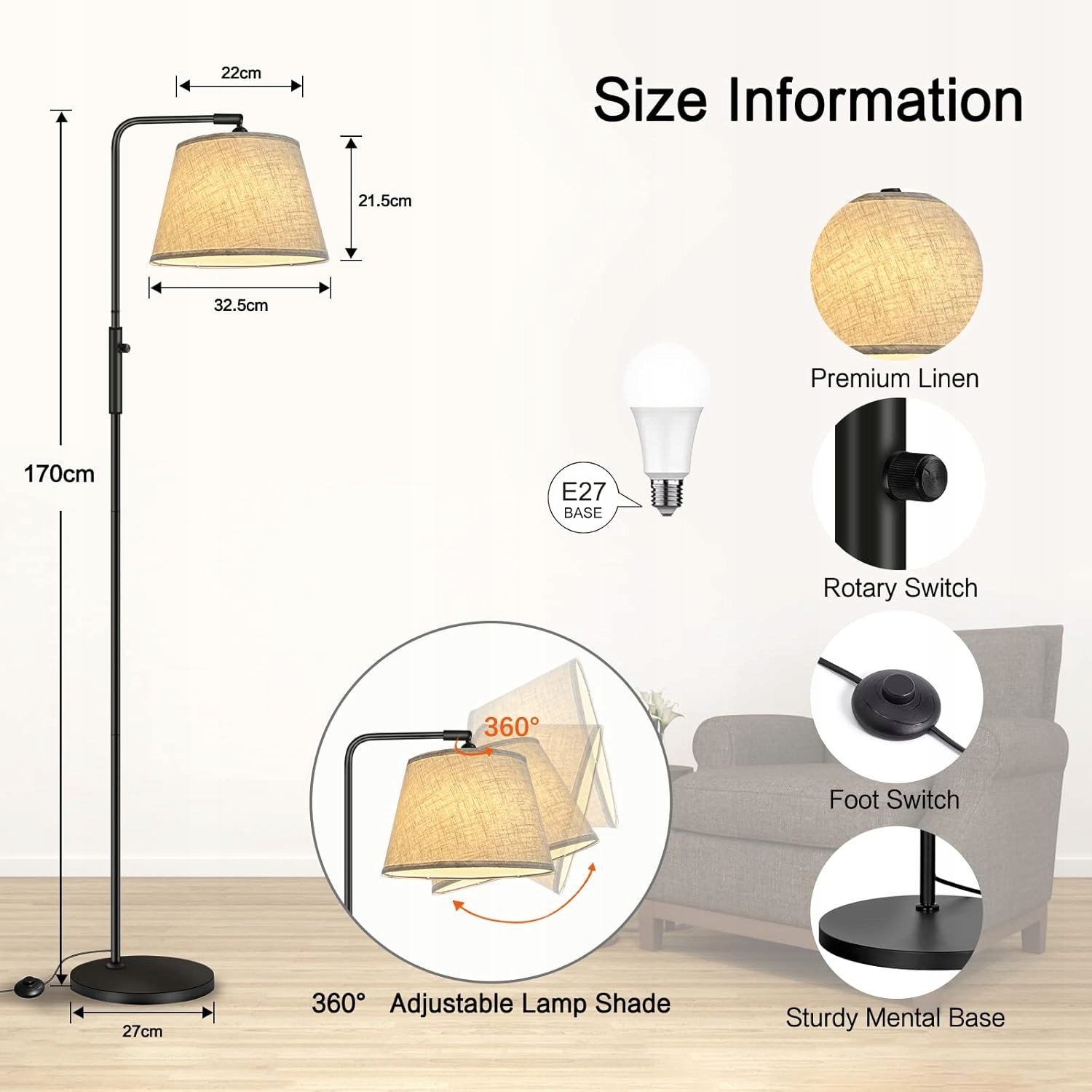 - Включена в лампочку 9 дюйма: Наша лампа для затемнення підлоги оснащена лампочкою з ручкою E27, яка має термін служби в 25 000 годин і може заощадити 90% енергії. Світлодіодна цибулина також має високу яскравість до 1000 люменів і ідеально підходить для читання та навчання. Це захищає очі від світлого мерехтіння. Інші цибулини з ручкою E27 сумісні, якщо потужність менше 90 століття. 4 Ефективно запобігає нещастям внутрішньої лампи та випадковим перекиданням будь -кого, включаючи дітей. Незалежно від того, розміщується він у вітальні чи у спальні, це дуже безпечно і практично.