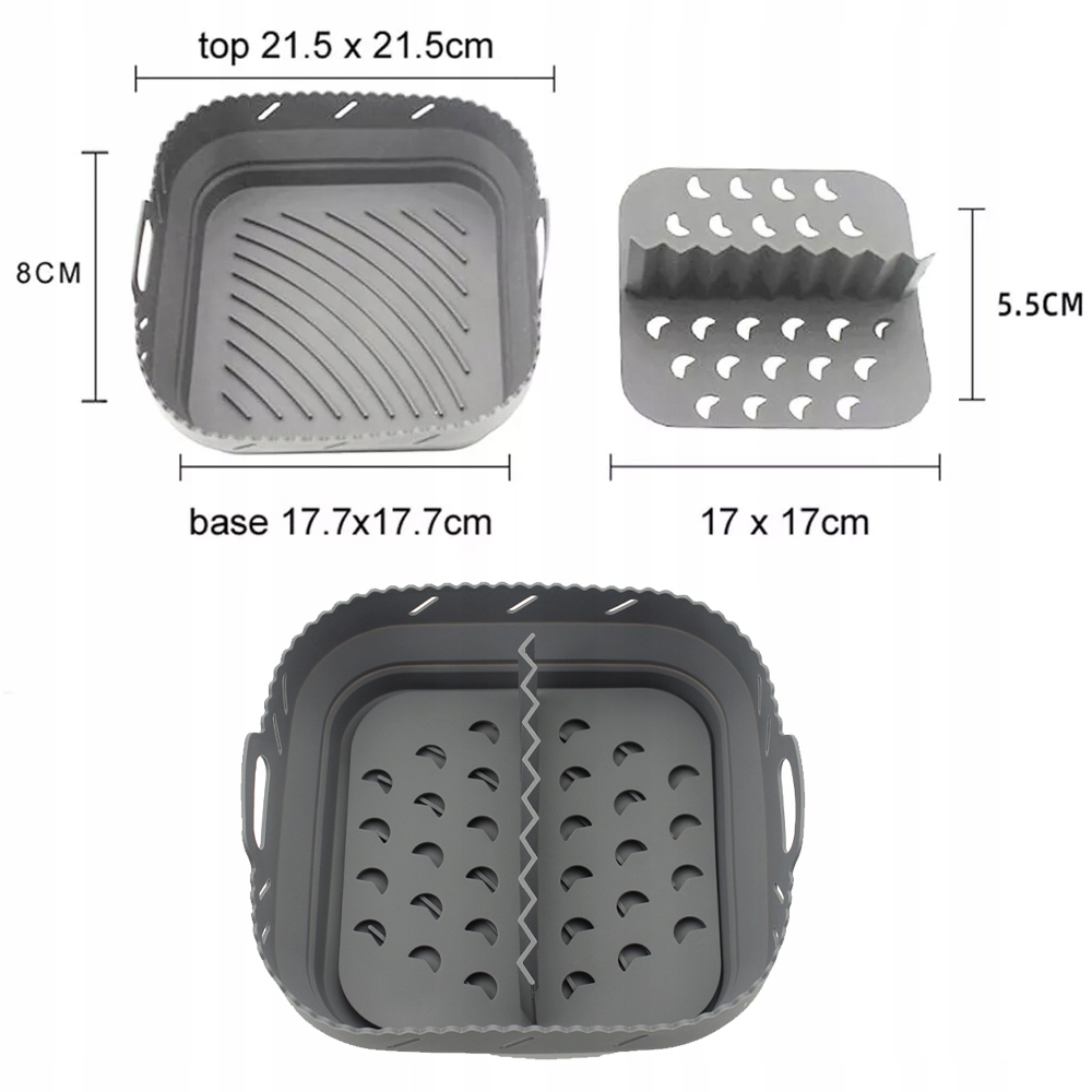 🔥 【Покращений дренаж олії та дві зони нагрівання】Квадратна силіконова вставка має рельєфну вертикальну конструкцію з перфорованим дном, що ефективно видаляє надлишок олії та жиру з їжі, запобігаючи її намокання та зменшуючи споживання жиру. Оснащена знімною перегородкою, силіконова форма дозволяє одночасно готувати дві різні страви - наприклад, овочі та м'ясо - без змішування смаків. Ідеально підходить для приготування хрустких страв ресторанної якості, зберігаючи при цьому ваші страви збалансованими та організованими.