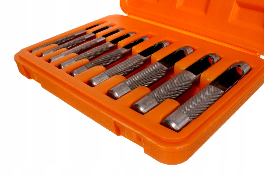 Набір з 9 круглих шкіряних дироколів розміром 3-12 мм. Виготовлений зі сталі, що забезпечує швидке та легке різання шкіри та матеріалів подібної твердості. Кожна фреза має шорстку частину, яка полегшує захоплення. Отвір збоку забезпечує швидке видалення розрізаного матеріалу.