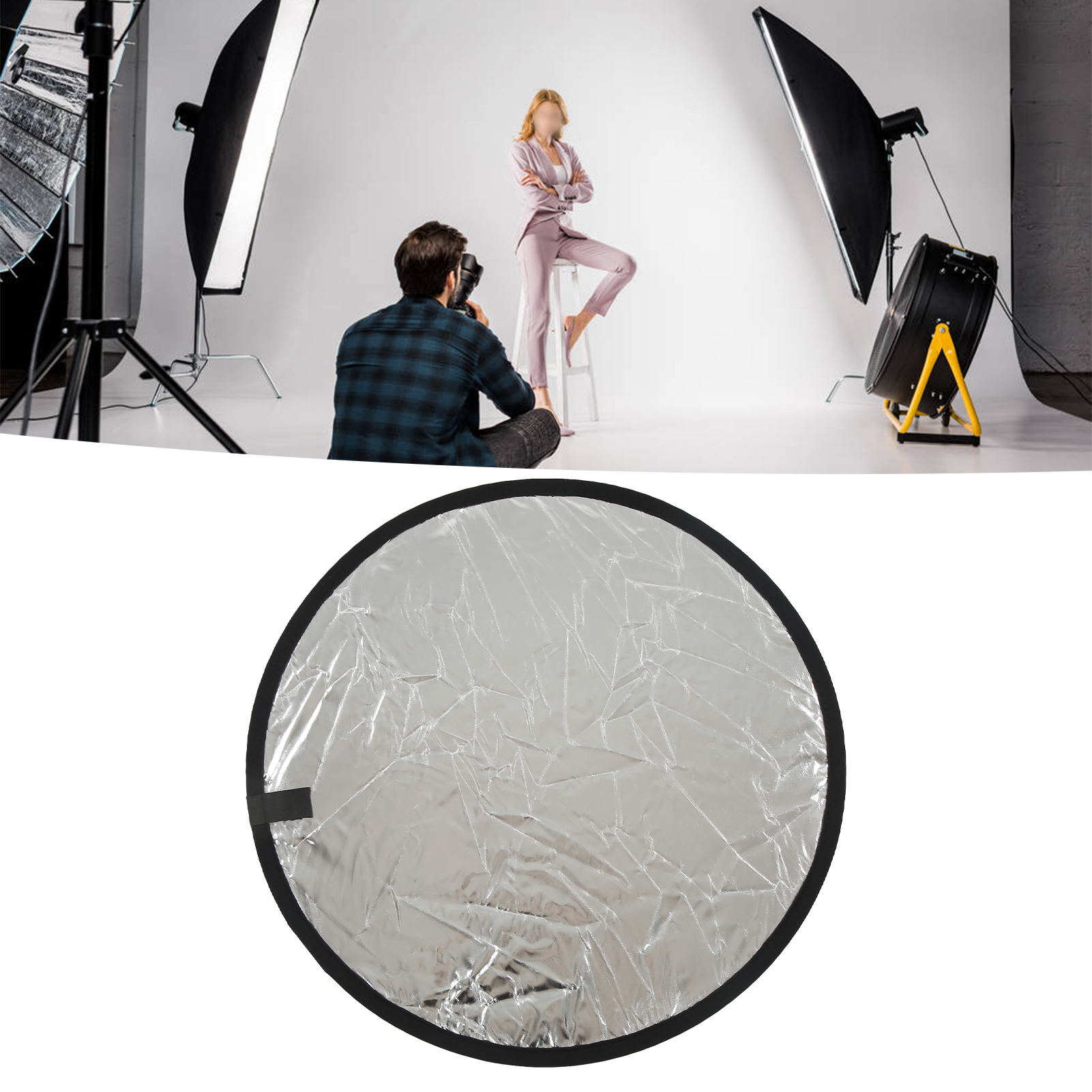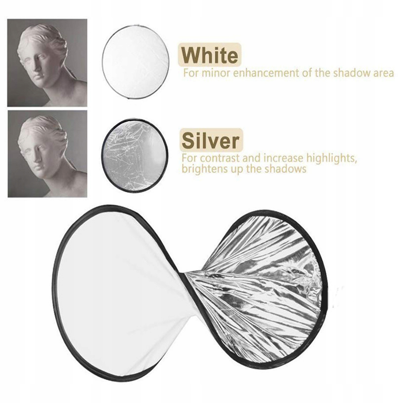 5. Срібне відображення: яскравіше і плавніше, як дзеркало, що є найбільш часто використовуваним типом відбивачів. Вплив цього відбивача легко відображається на очах пацієнта, що викликає велике яскраве рибальське світло. Він використовується, коли хмарно і світло надходить головним чином від голови пацієнта. Розмістіть його безпосередньо під обличчям сутності, щоб він знаходився поза полем камери і відображав верхнє світло на обличчі пацієнта. У затьмарених умовах білі відбивачі не мають такого сильного впливу.