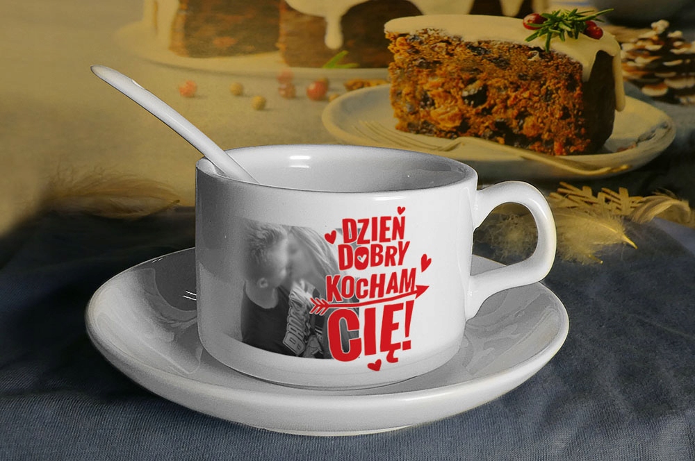 фото чашка з відбитком, ложка та блюдце