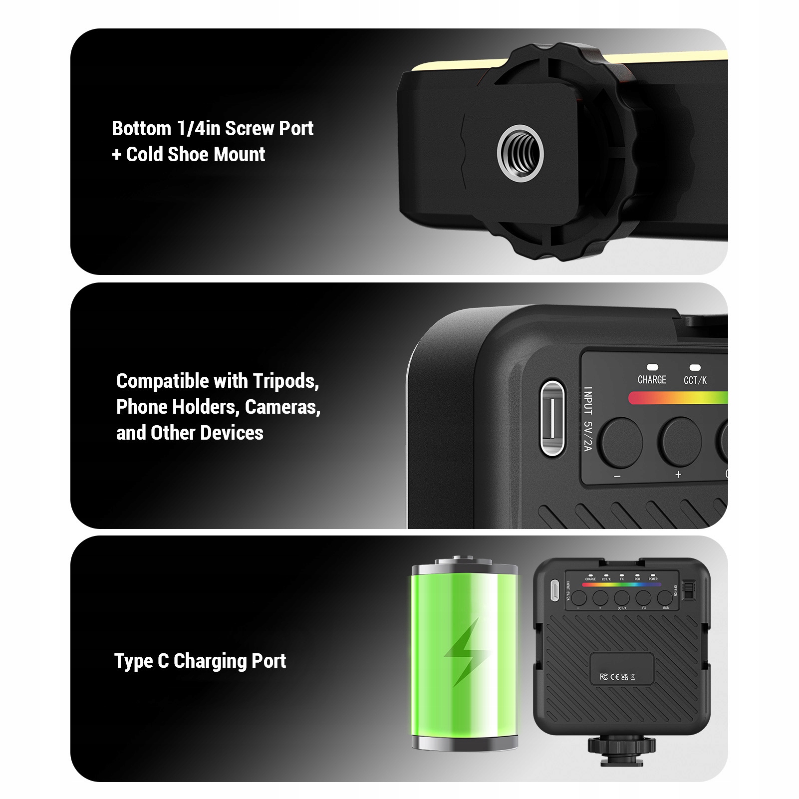 5. Універсальне використання: підходить для різноманітних сцен, включаючи сімейні зустрічі, прямі трансляції на відкритому повітрі, створення коротких відео та комерційну зйомку. 3 кріплення холодного башмака та отвір для гвинта 1/4 дюйма забезпечують надійну сумісність, забезпечуючи гнучкість налаштування освітлення.