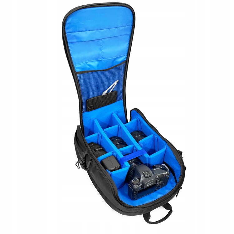 У нього можна розмістити цифрову дзеркальну камеру зі спалахами та кількома об’єктивами залежно від їхніх розмірів, а також необхідні аксесуари. Додаткові кишені та відділення допоможуть упорядкувати дрібні речі, такі як карти пам’яті, зчитувач, кабелі чи особисті речі. Блискавка забезпечує швидкий доступ до внутрішньої частини. Крім того, рюкзак має відділення, куди можна помістити ноутбук або планшет.