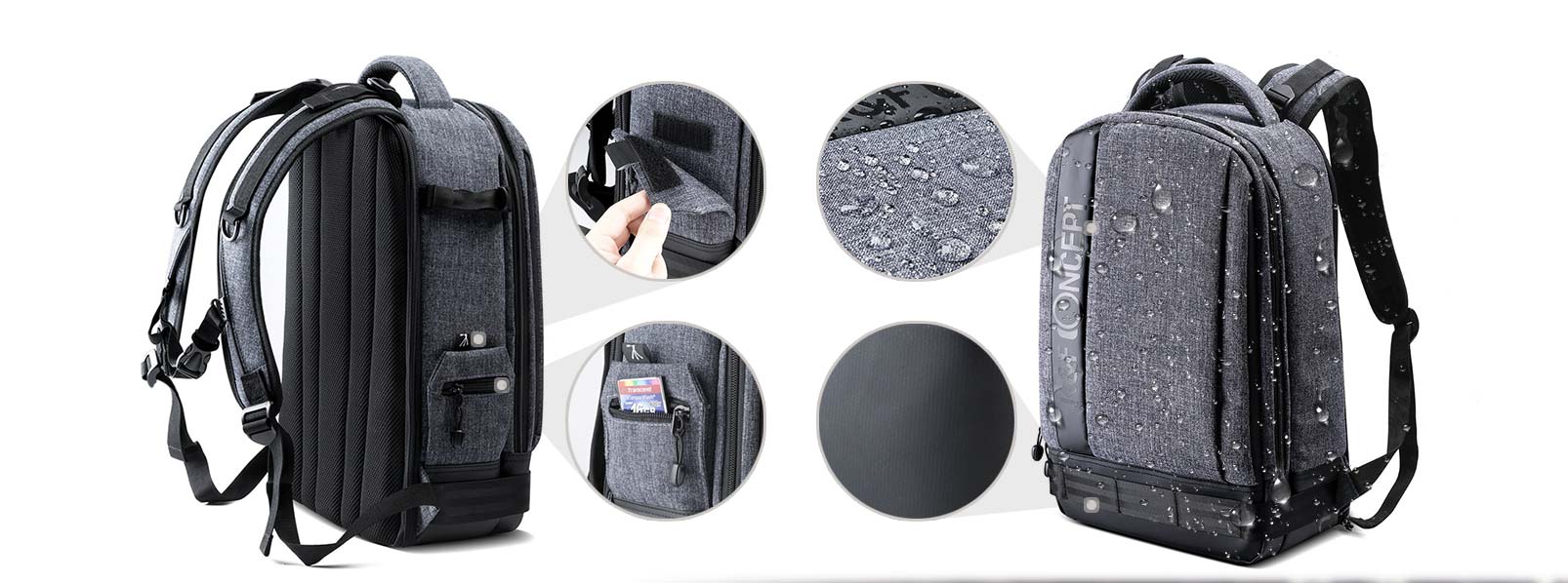 Рюкзак розділений на 2 відділення: переднє для ноутбука, планшета, кабелів та інших аксесуарів, а заднє - для фототехніки (передбачено безпечний доступ зі спини).