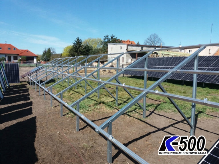Представлена конструкція на землі від K500 — це міцний і сучасний сталевий каркас для встановлення 20 фотоелектричних панелей у вертикальному розташуванні.