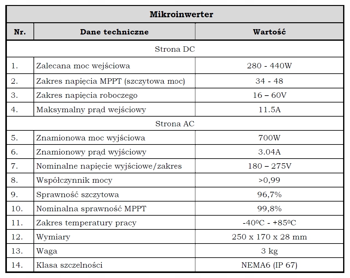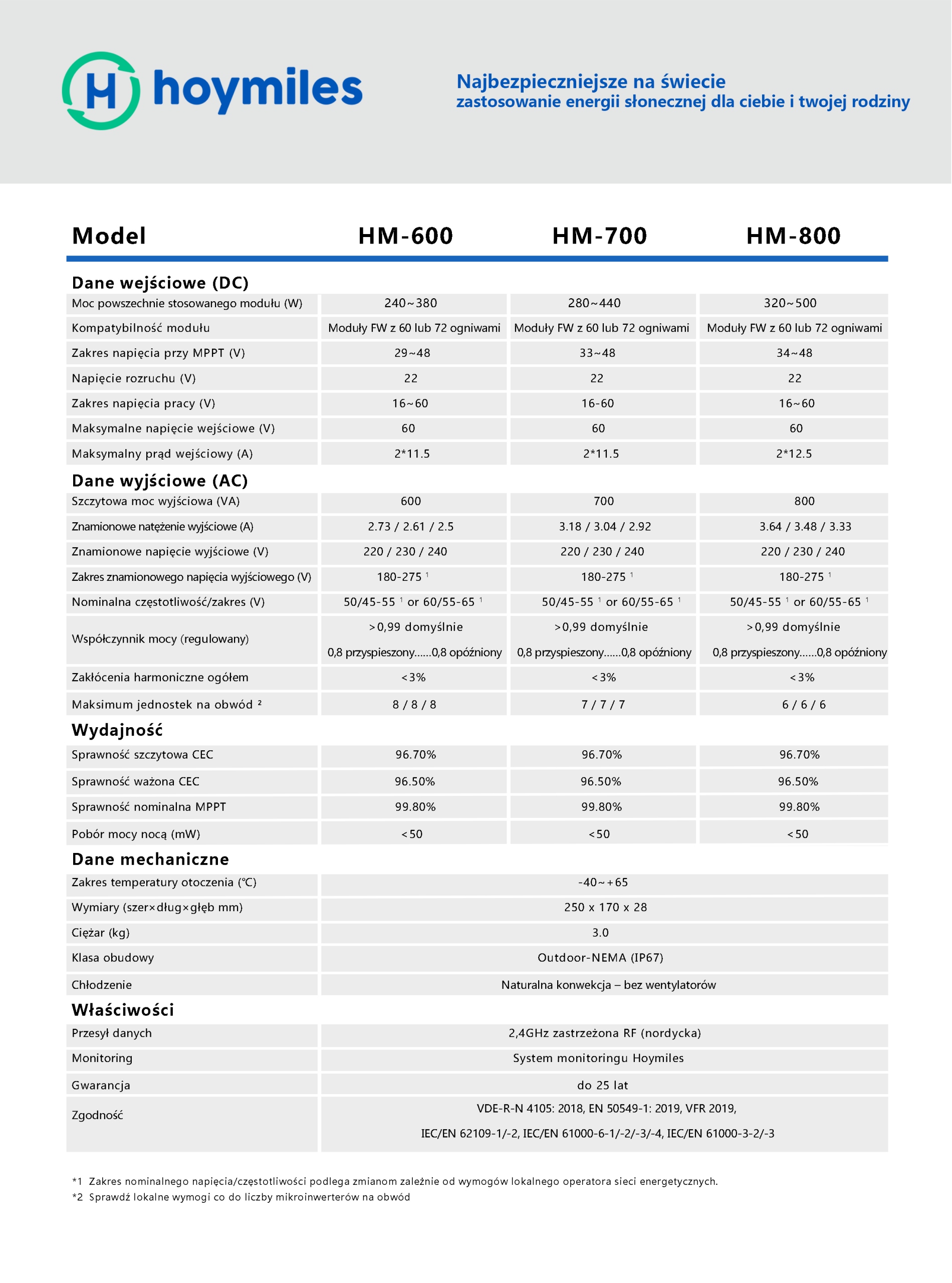 Пропонований інвертор від Hoymiles, одного з найбільші виробники мікроінверторів для фотоелектричних установок, які представляють 2-канальний мікроінвертор, з'єднаний в системний ланцюг, що характеризується надзвичайно широким діапазоном вхідної напруги постійного струму (16-60 В) і низькою початковою напругою (лише 22 В). З ефективністю перетворення до 96,7% і ефективністю MPPT до 99,9% мікроінвертор Hoymiles є одним із найкращих у світі.
