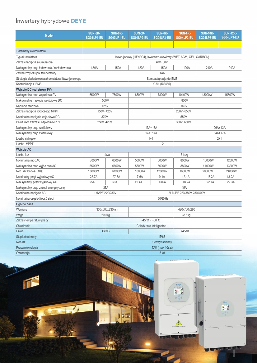 гібридний інвертор Deye ідеально підходить для домашніх додатків, а також мікроприводів, які хочуть виробляти електроенергію самі, з можливістю зберігання енергії, виробленої енергією і навіть продати її постачальнику енергії. У інвертерах Deye можна підключити 2 MPPT -речовини, що є значущим, пристрій може та функціональність пристрою. Надлишки зарядки електроенергії батареї, які використовуються для постачання приймачів вночі або похмурими днями. Завдяки можливість роботи в системі Grid, інвертор може перепродати зайву енергію, вироблену локальною енергією. Тому у разі відмови енергетичної мережі генератор може заряджати акумулятори, які забезпечать живлення приймачам. Інвертори Deye можуть працювати лише в системі поза мережею. Лише два джерела живлення достатньо для роботи (наприклад, сонячні батареї та акумулятор або мережа).