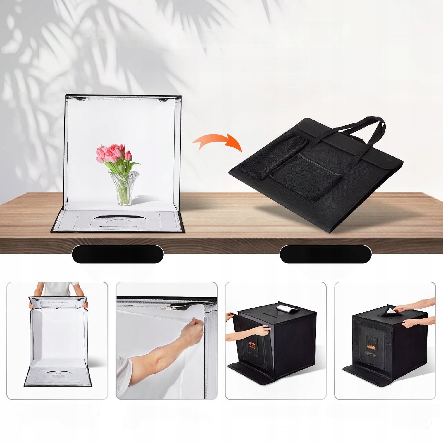 Професійний світлодіодний фотографічний лайтбокс був розроблений для створення фотографій продуктів найвищої якості. Оснащений 160 світлодіодами з плавним регулюванням яскравості та колірною температурою 3000-5600 K, він забезпечує рівномірне світло без мерехтіння, яке точно відтворює кольори. Це робить його ідеальним рішенням для фотографів, онлайн-продавців і творців контенту.