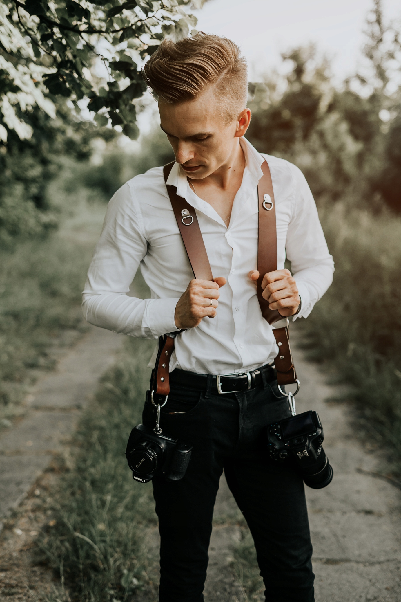 Підписані індивідуальним логотипом, підтяжки призначені для одного або двох боді. Коричнева шкіра польського виробництва, має лакований край ременя, що захищає ремінь від потертості. Камера кріпиться за допомогою універсального гвинта 1/4" і сталевого карабіна M6, а сталевий D-кільце служить елементом, який ковзає по шкірі. Додатковим захистом камери від від'єднання є надзвичайно міцна 10-міліметрова стрічка, що кріпиться з карабіном M4. Довжина лямок регулюється за допомогою кількох отворів. Розповсюдження плетіння на спині за допомогою машинної заклепки.