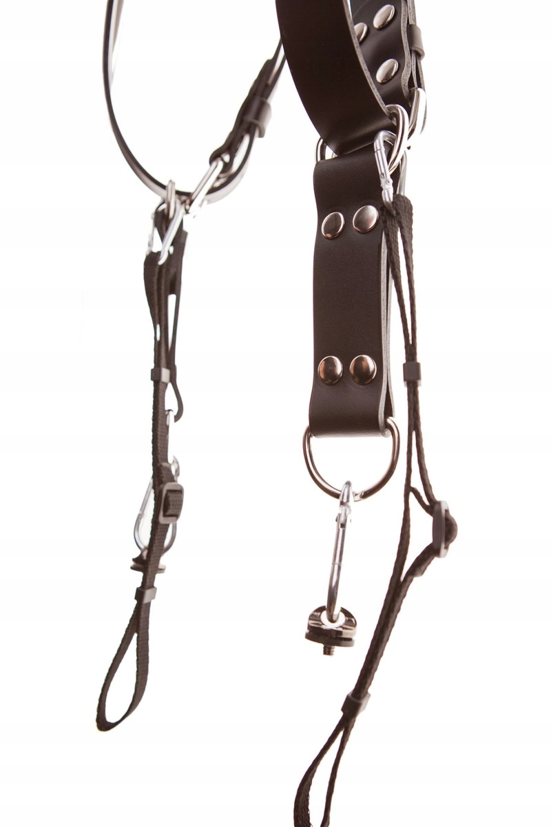 Пояс розрахований на один або два боді. Шкіра кольору темного шоколаду має італійське походження, має красиву структуру натуральної зернистої шкіри та закріплена лакованим краєм ременя, захищаючи його від потертості. Камера кріпиться за допомогою універсального гвинта 1/4" і сталевого карабіна M6, а сталеве D-кільце служить елементом, який ковзає по шкірі. Надзвичайно міцна стрічка 10 мм, закріплена карабіном M4, служить додатковим захистом для камери проти від’єднання. Довжина лямок регулюється за допомогою кількох отворів. Поширюючи плетіння на спині за допомогою машинної заклепки.