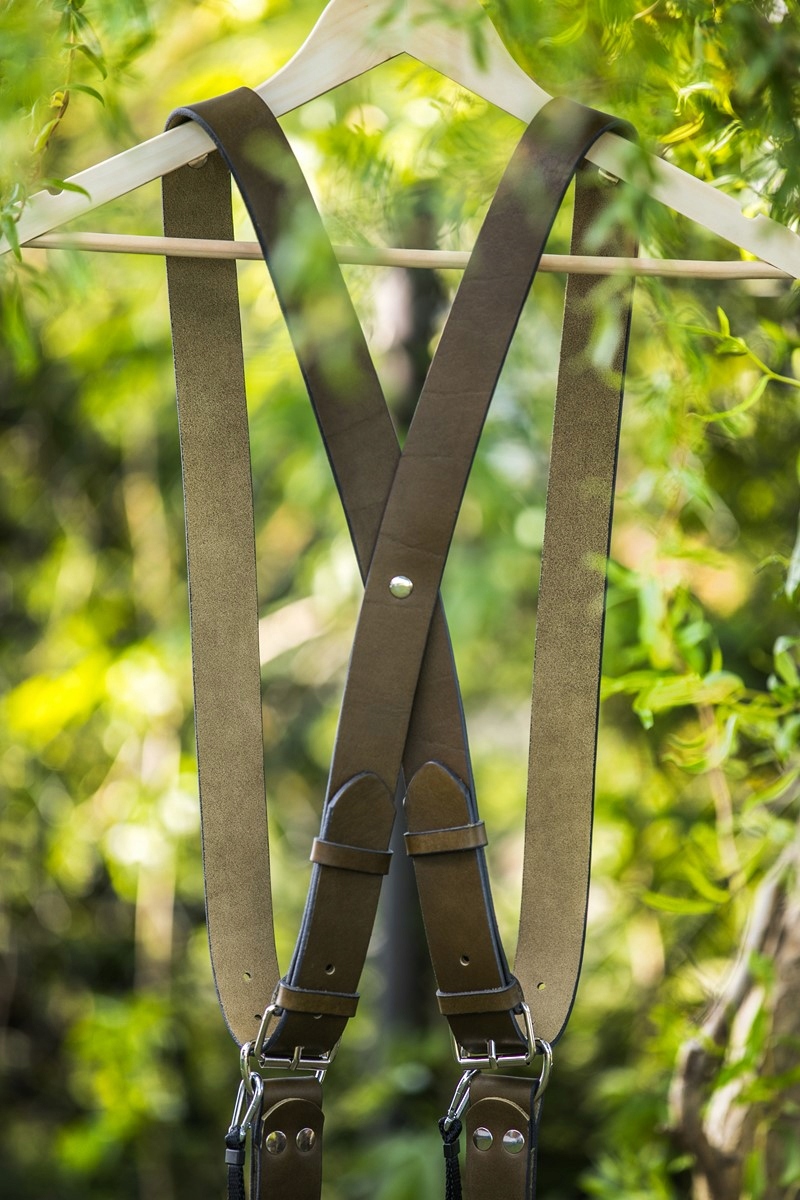 Підтяжки призначені для одного або двох боді. Шкіра кольору OLIVE, cognac, коричневий, чорний або темно-синій польського походження, має красиву структуру натуральної зернистої шкіри та надійна з лакованим краєм пояса, який захищає його перед тим, як подрібнити. Камера кріпиться за допомогою універсального гвинта 1/4" і сталевого карабіна M6, а сталевий D-кільце служить елементом, який ковзає по шкірі. Додатковим захистом камери від від’єднання є надзвичайно міцна 10-міліметрова стрічка, що кріпиться з карабіном M4. Довжина лямок регулюється за допомогою кількох отворів, що розповсюджуються на спині за допомогою машинної заклепки.