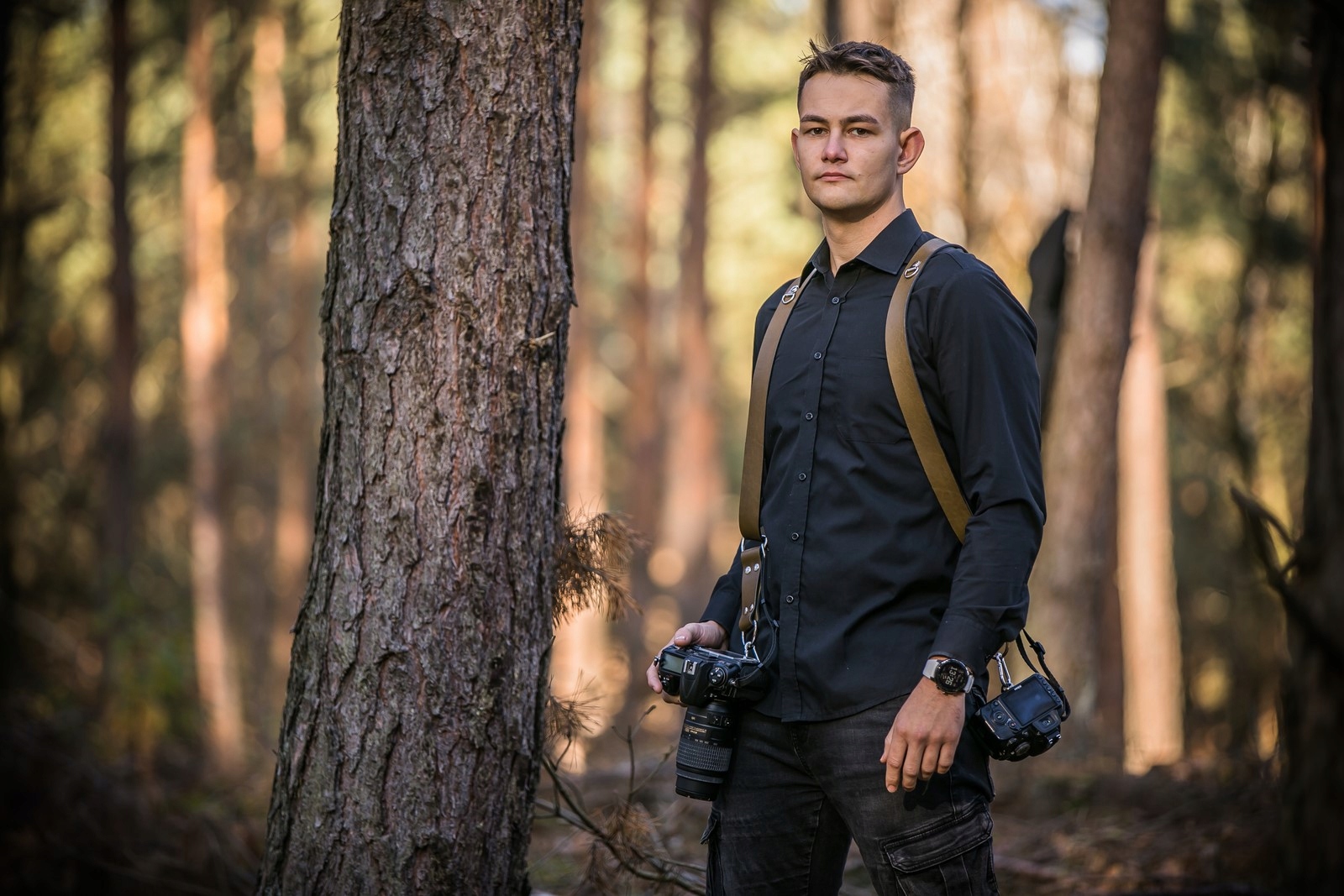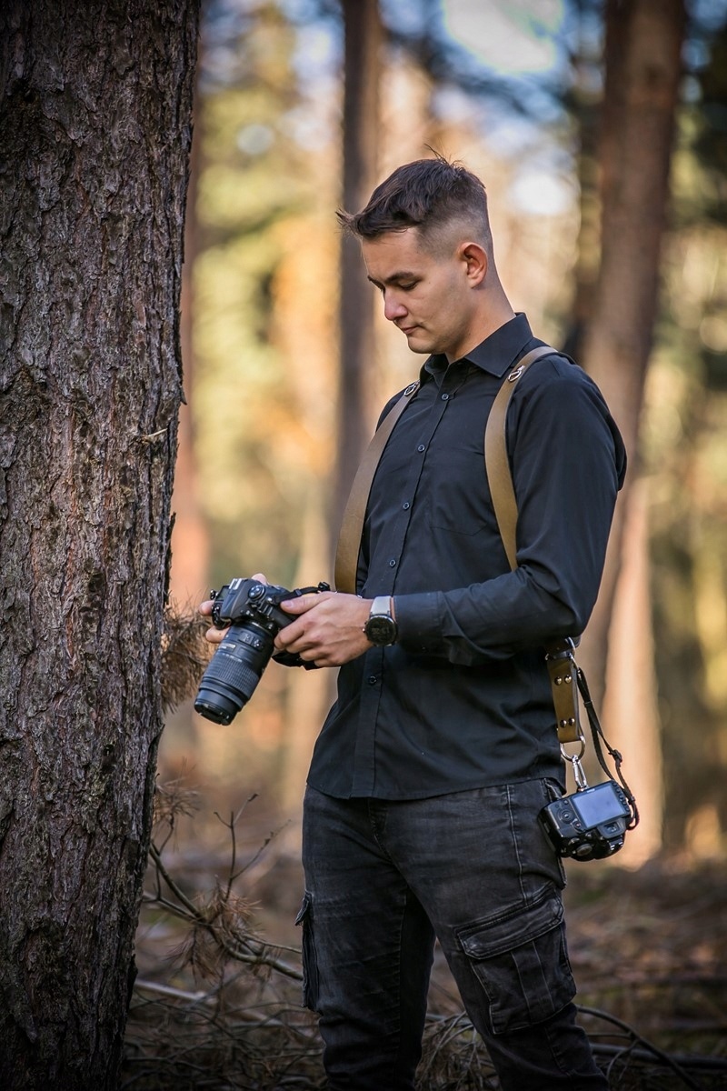 Підтяжки призначені для одного або двох боді. Шкіра кольору OLIVE, cognac, коричневий, чорний або темно-синій польського походження, має красиву структуру натуральної зернистої шкіри та надійна з лакованим краєм пояса, який захищає його перед тим, як подрібнити. Камера кріпиться за допомогою універсального гвинта 1/4" і сталевого карабіна M6, а сталевий D-кільце служить елементом, який ковзає по шкірі. Додатковим захистом камери від від’єднання є надзвичайно міцна 10-міліметрова стрічка, що кріпиться з карабіном M4. Довжина лямок регулюється за допомогою кількох отворів, що розширюють плетіння на спині за допомогою машинної заклепки.