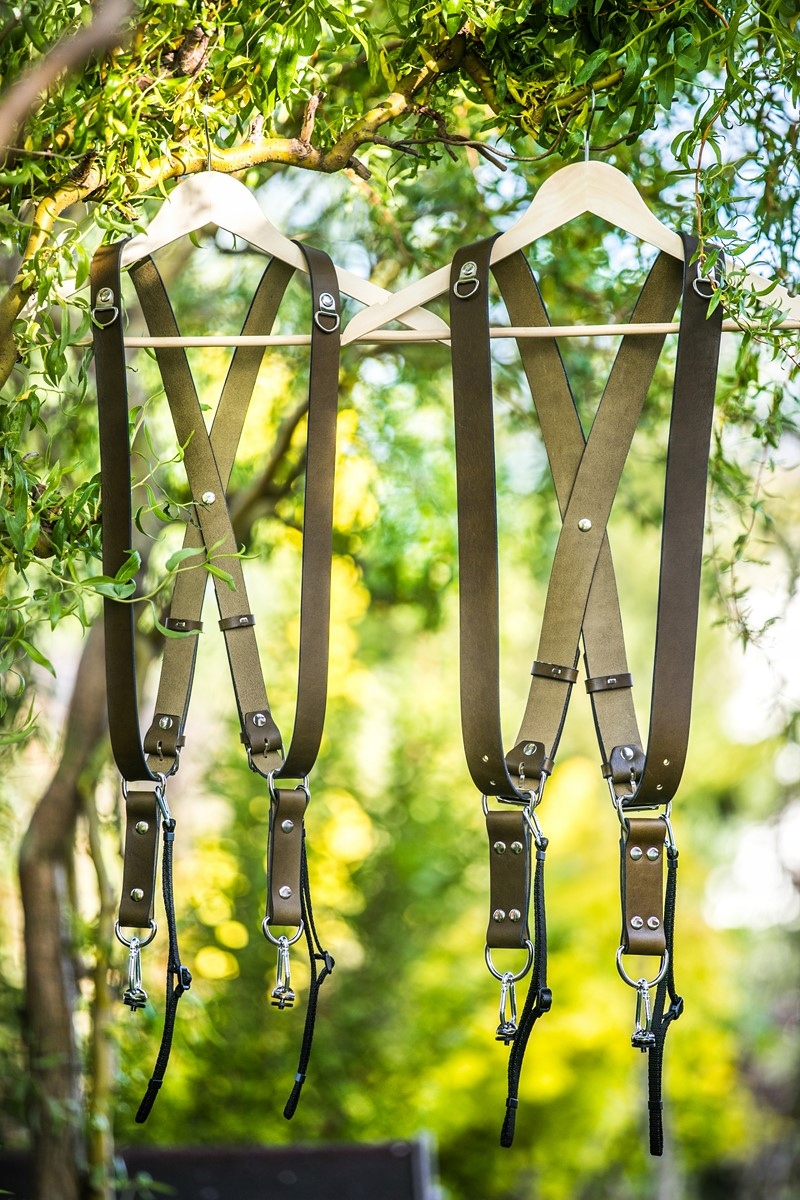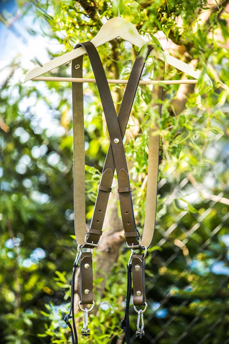 Підтяжки призначені для одного або двох боді. Шкіра кольору OLIVE, cognac, коричневий, чорний або темно-синій має польське походження, має красиву структуру справжньої зернистої шкіри та закріплена лакованим краєм ременя , захищаючи його від зношування. Камера кріпиться за допомогою універсального гвинта 1/4" і сталевого карабіна M4, а сталевий D-кільце служить елементом, який ковзає по шкірі. Додатковим захистом камери від від’єднання є надзвичайно міцна 10-міліметрова стрічка, що кріпиться. з карабіном M4. Довжина лямок регулюється за допомогою кількох отворів. Розповсюдження плетіння на спині за допомогою машинної заклепки.