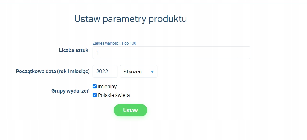 1. Увійшовши за посиланням, задайте такі параметри, як кількість штук, дата початку в календарі, додаткові події. Виберіть шаблон із багатьох доступних і почніть створювати свій календар.