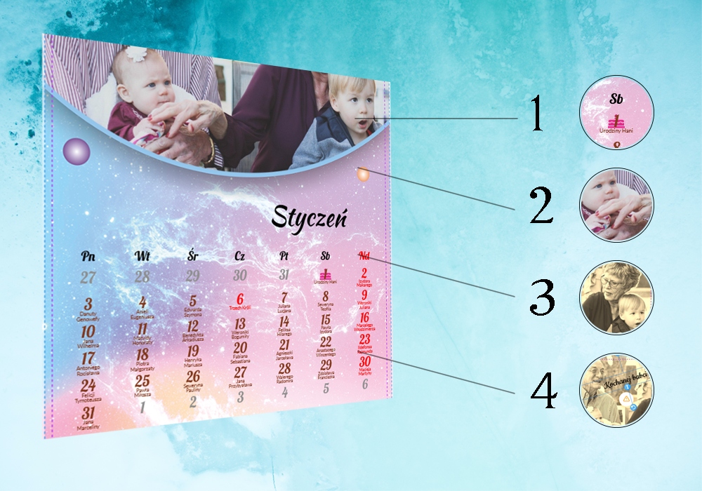 Фотокалендар є дуже практичним гаджетом, який буде працювати в кожному домі, а також гарною прикрасою та сувенір - ви самі обираєте тему календаря, фото, деталі. Наш творець надає вам практично необмежені можливості! Якщо ви хочете милуватися своїми святковими фотографіями цілий рік, не біда, створіть їх самі! А може, ви віддаєте перевагу, щоб з вами була вся родина та найближчі друзі? Створіть календар із їхніми фотографіями!