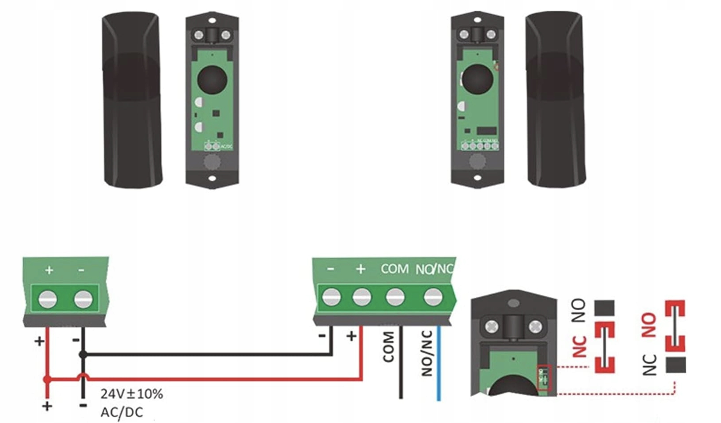 Наші передавачі потребують з'єднання двох вен, що постачають живлення. 4 NC/No виходи встановлюються перемичкою на друку.