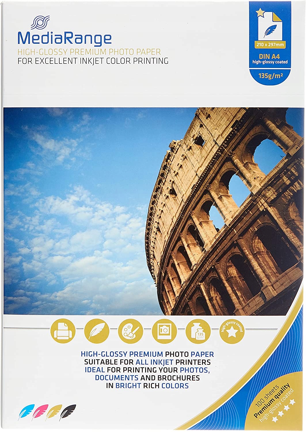 Фотопапір MediaRange — це продукт, який під час друку на струменевих принтерах може отримати фотографічну якість. Цей папір має роздільну здатність друку 5760 точок на дюйм і щільність 135 г/м2.