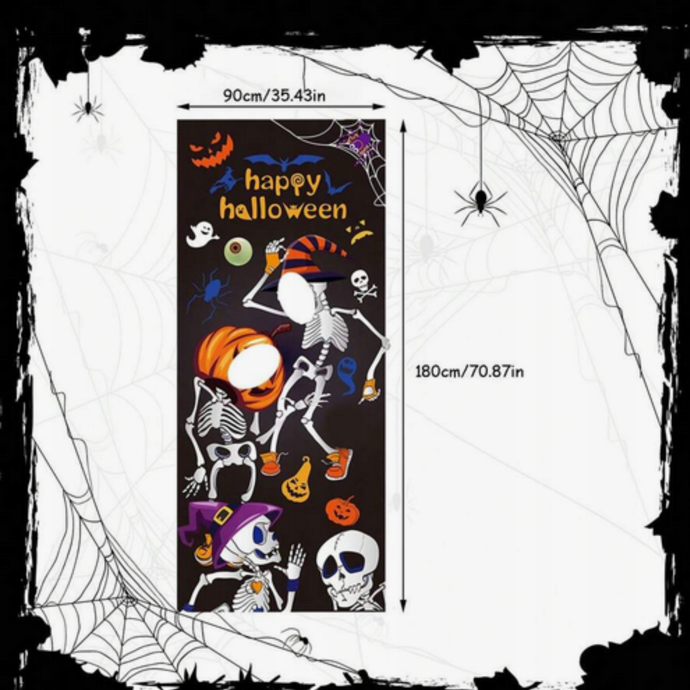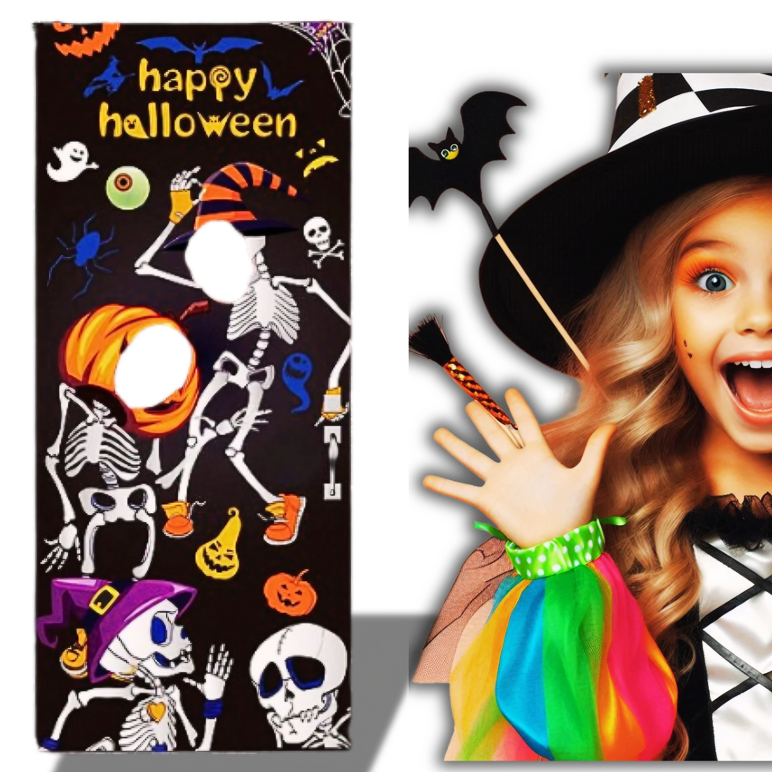 ✔️ Фотостіна була створена з думкою про ХЕЛЛОВІН, тому на ній присутній мотив Хелловіна, тобто привиди, павуки , кажани, гарбузи та 2 скелети, на яких діти можуть перетворитися, помістивши свої обличчя в призначені для цього отвори.