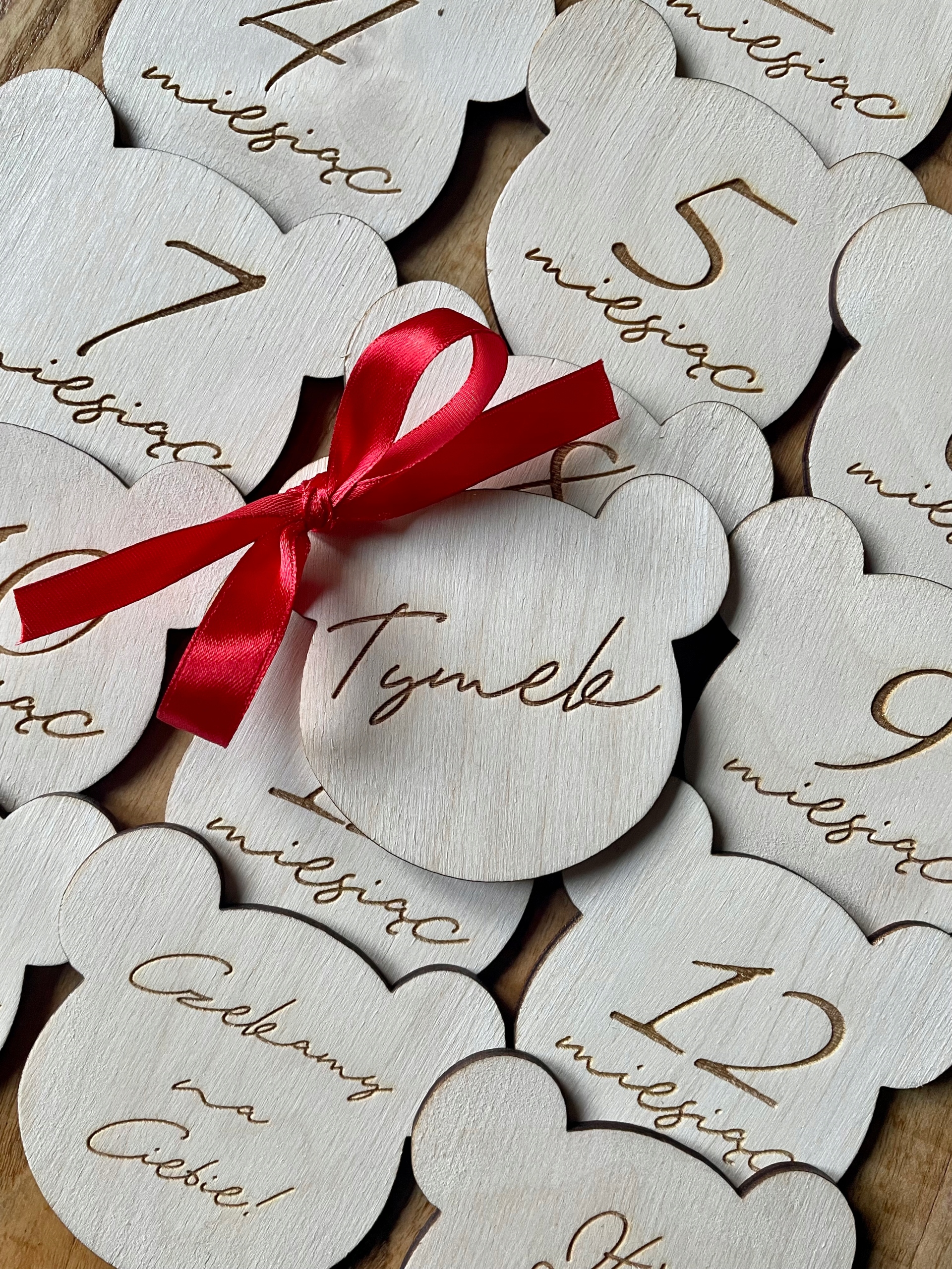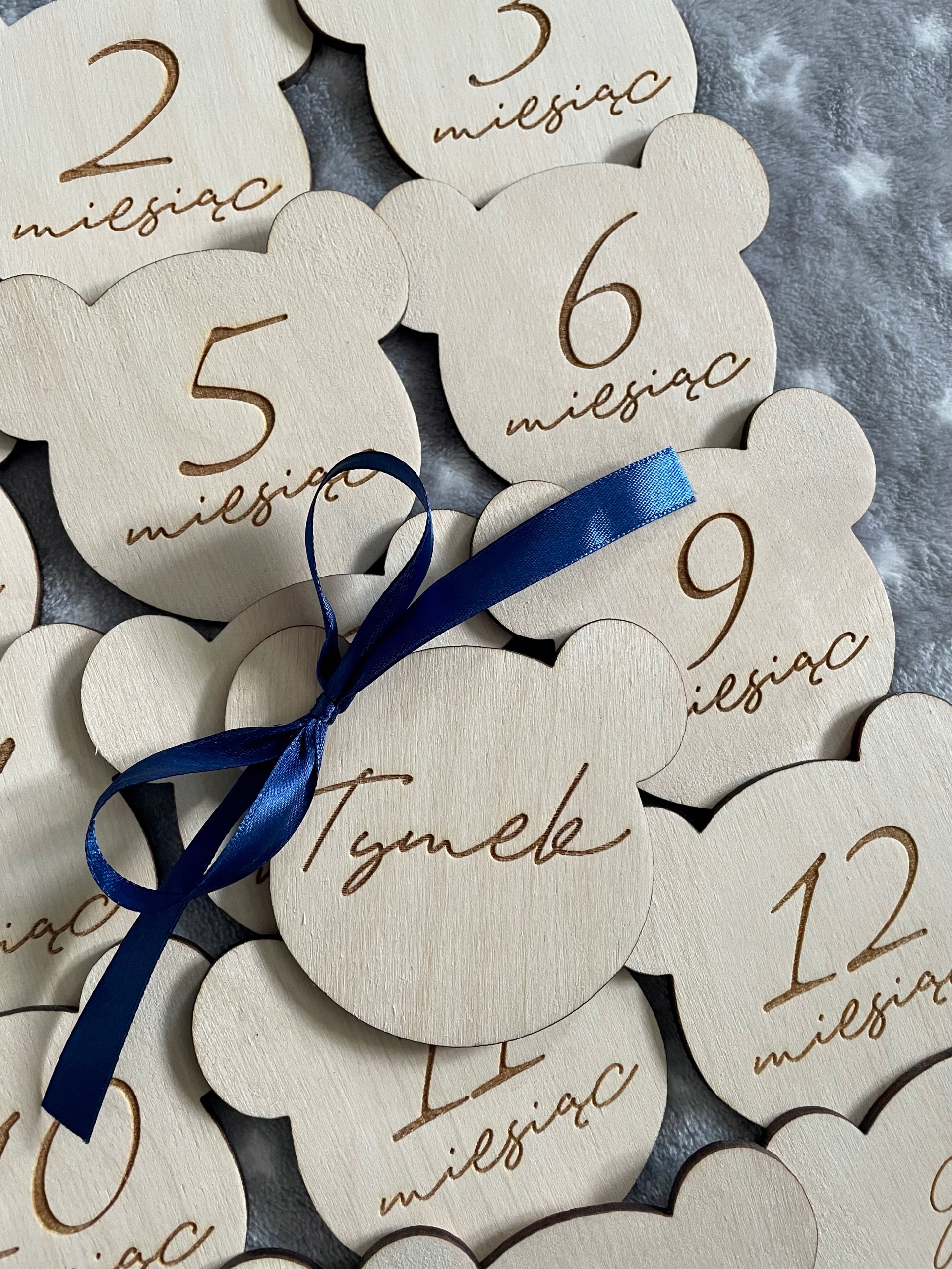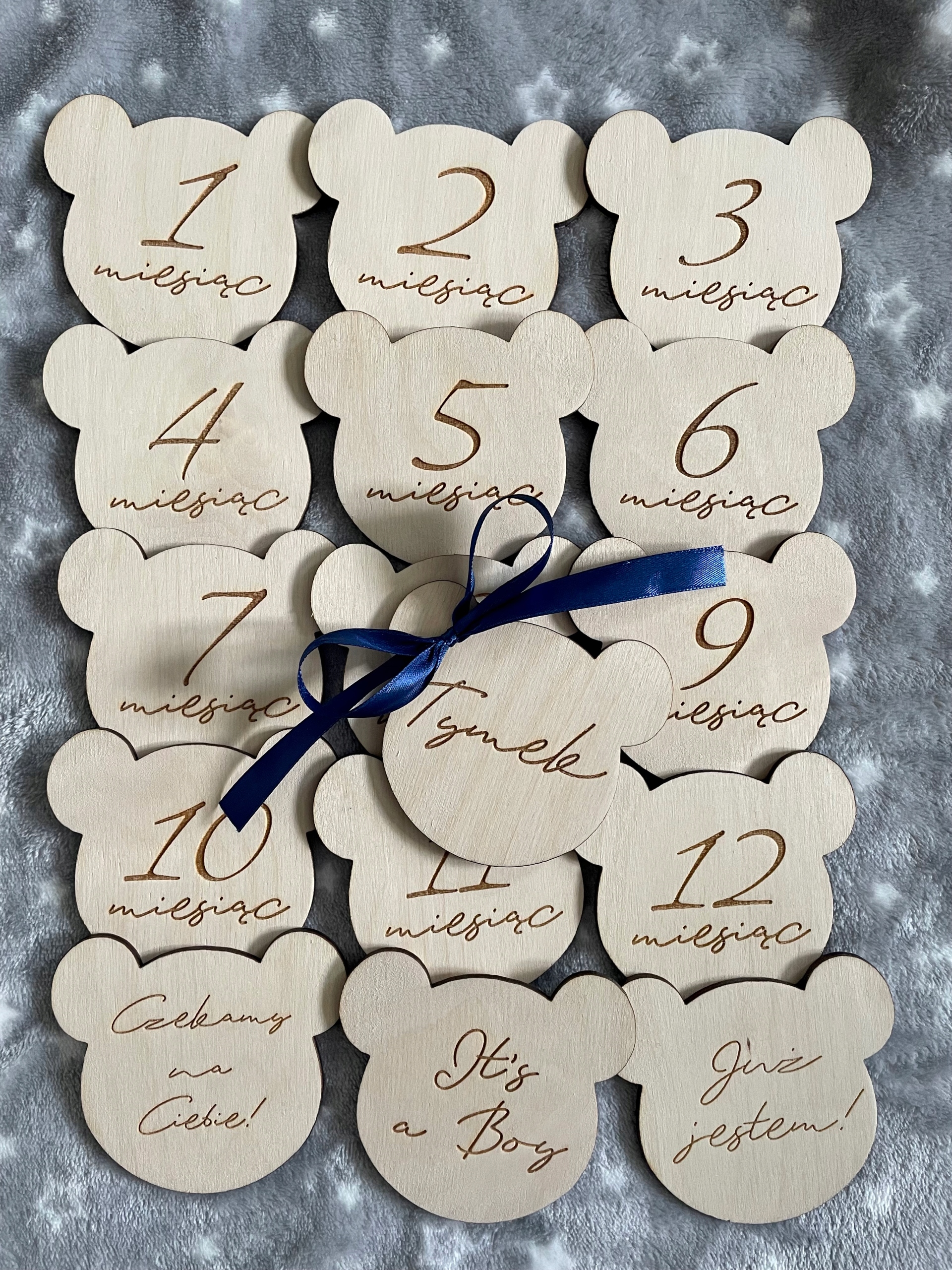 Ведмедики Дерев'яні дошки для фотографій малюка - ПЕРШИЙ РІК ЖИТТЯ - 16 шт + бантик + декоративна коробка