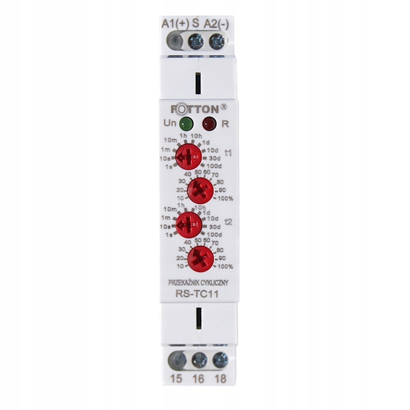 Реле на основі мікропроцесора. Дозволяє циклічне керування приймачем, циклічна робота починається з паузи або імпульсу. Пристрій має дуже високу точність налаштування часу роботи і перерви в 10 діапазонах від 1 с ... до 100 днів! Має сигналізацію початкового стану - робота і перерва. Зручна установка на рейку TH35.