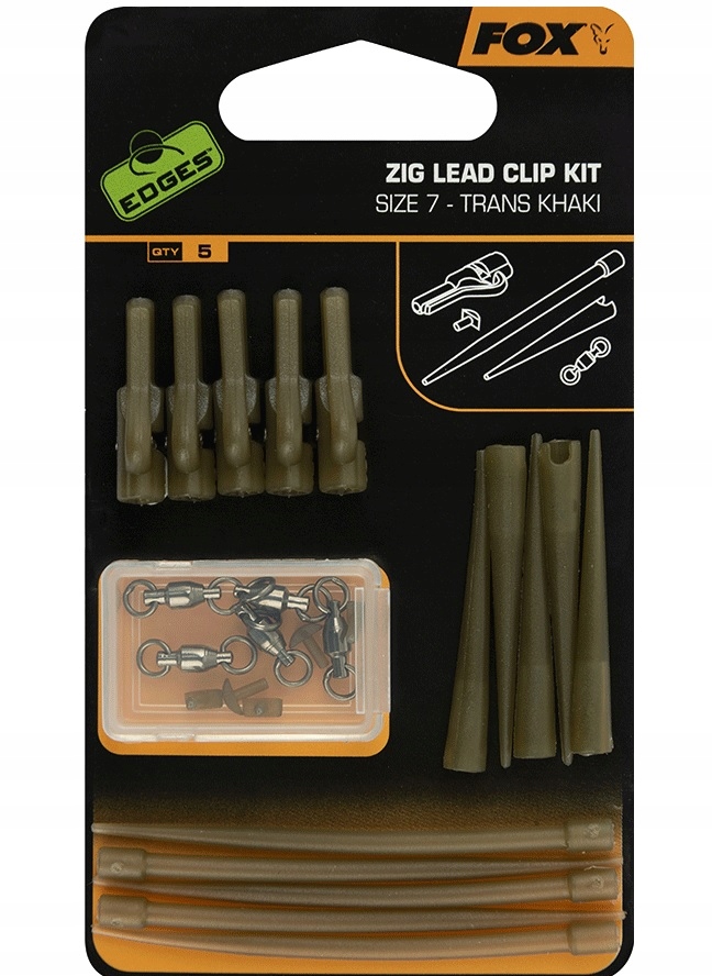 Набір включає: 5 гумових насадок Naked Line Tail, 5 затискачів Zig Lead, 5 кулькових опорні вертлюги, 5 насадок проти заплутування XL, 5 T-Pegs для фіксації вертлюга в кліпсі