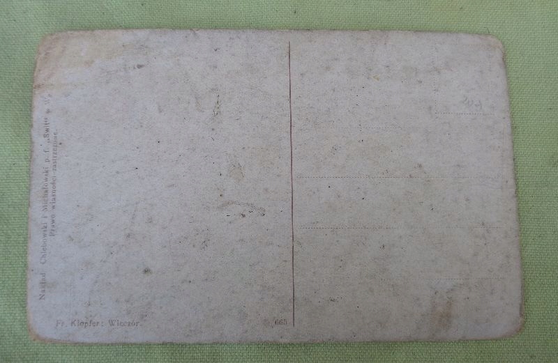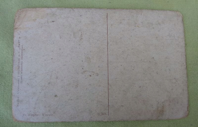 Цікава листівка 1910-1920 рр. видана у видавництві Świt у Варшаві Хлебовським і Міхаловським. Стан експонату видно на фото. Всі підписи видно на фото. На листівці зображено відбиток картини Францішека Клопфера «Вечір». Рекомендую всім.