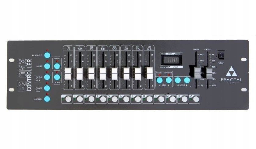 Fractal Lights F2 дозволяє зберігати до 100 сцен у пам’яті пристрою та розташовувати їх у 12 різних програмах. Він контролює до 192 каналів DMX, тобто до дванадцяти 16-канальних пристроїв. Є можливість регулювати швидкість і час переходу відтворюваних сцен, а також запускати їх під ритм музики. Крім того, всю пам'ять запрограмованого контролера F2 можна скопіювати на мініатюрну панель відтворення F3, також доступну в нашій пропозиції.