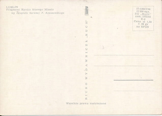 Просматривая «Фрагмент рынка Люблин - 028573» данный товар из каталога «Люблин и Подлясье» вы можете быть уверены, что после оформления заказа, доставки в Украину, вы получите именно то, что заказывали, в оговоренные сроки и европейского качества.