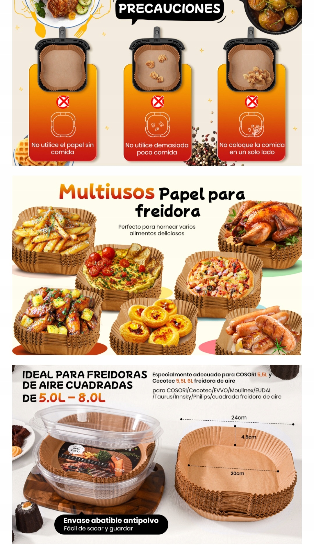 Папір для фритюрниці є водонепроникним та стійким до масла, щоб продовжити термін експлуатації кошика, захищаючи його від залишків їжі, плям нафти та подряпин.