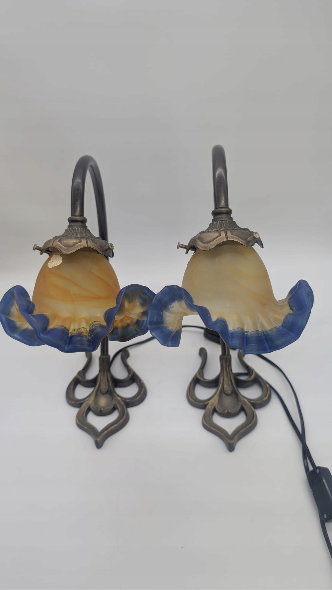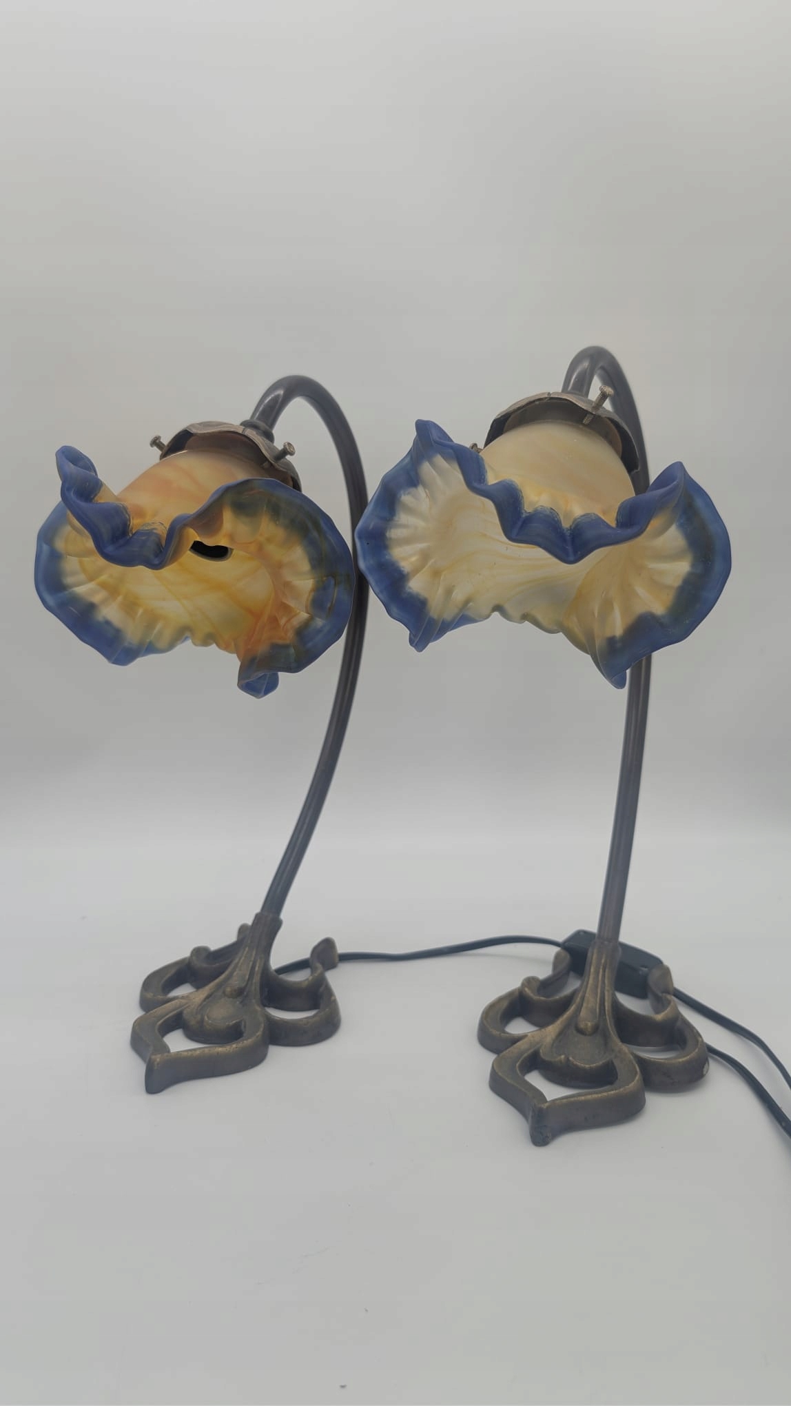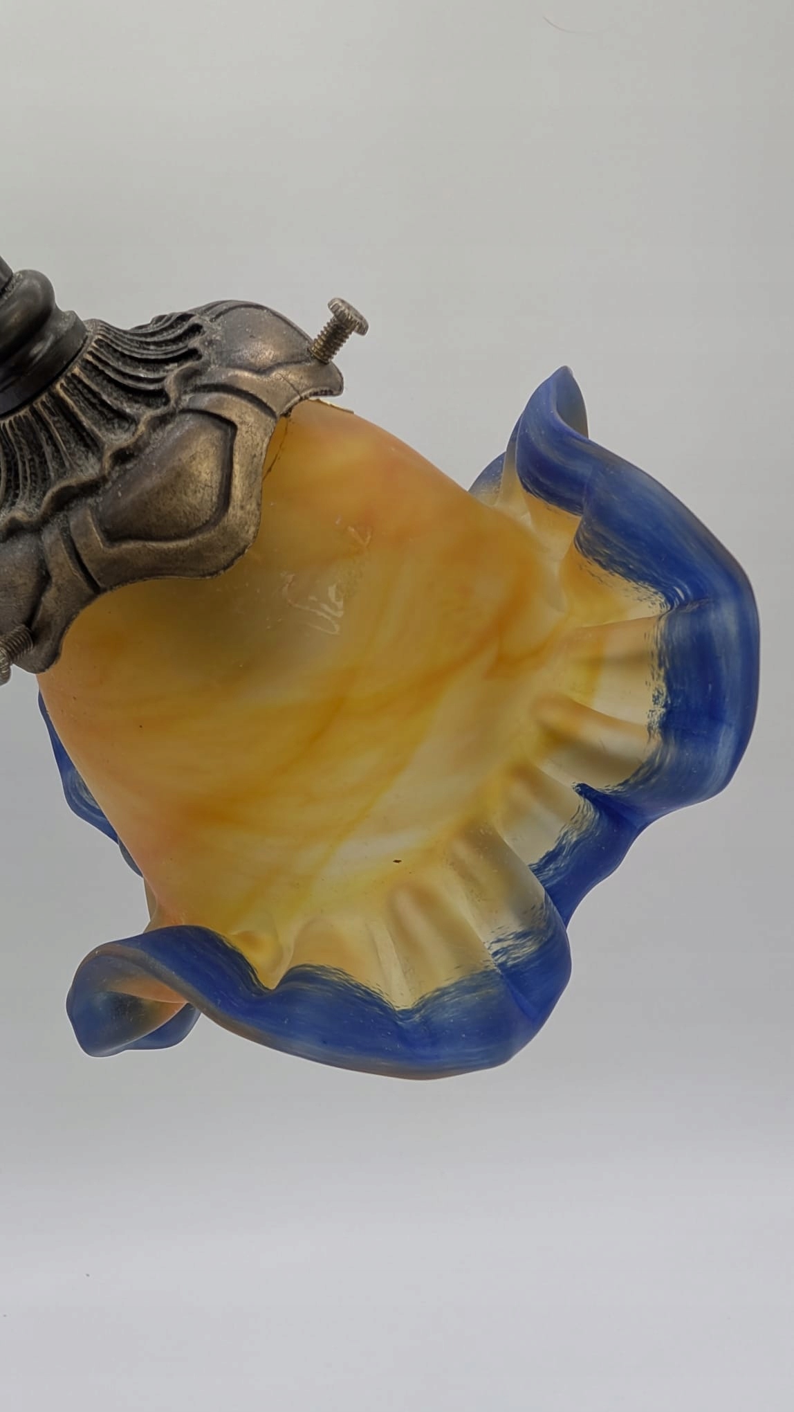 Старовинна французька нічна лампа в стилі модерн з кольоровим вітражним абажуром. Абажур у формі квітки, ймовірно, виготовлений зі скла в стилі Тіффані.