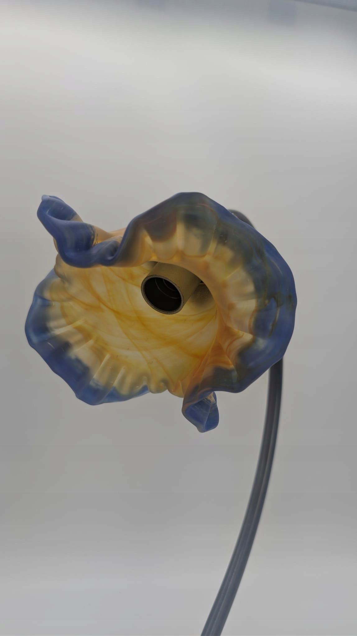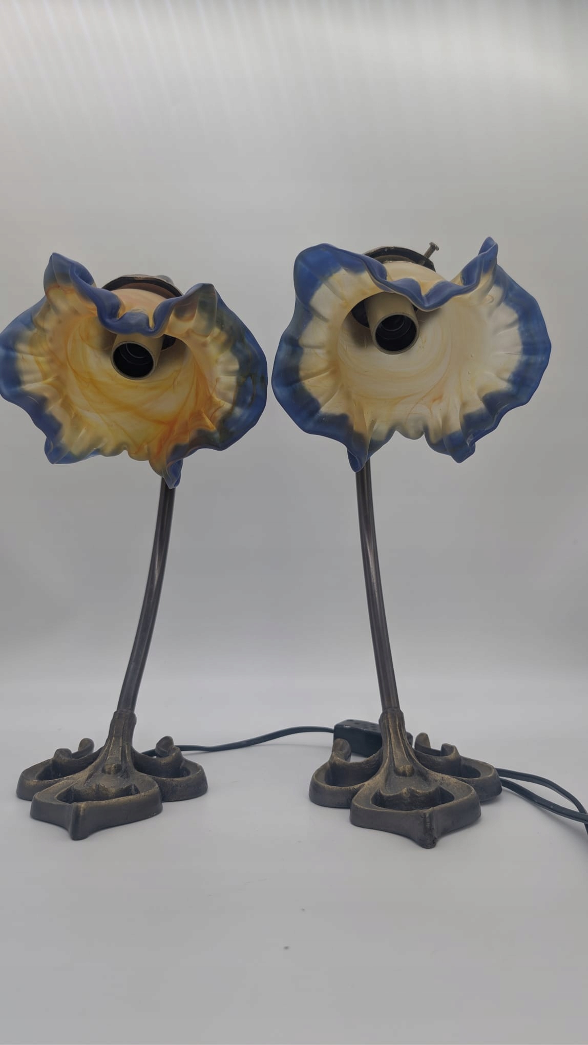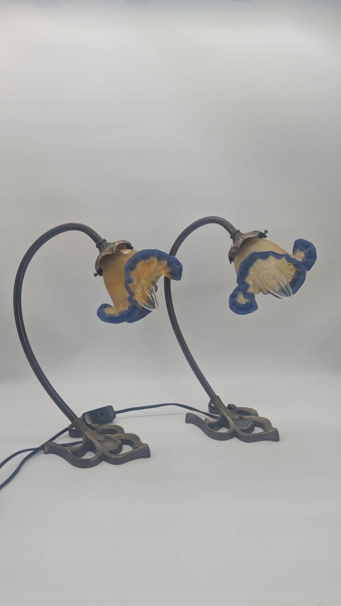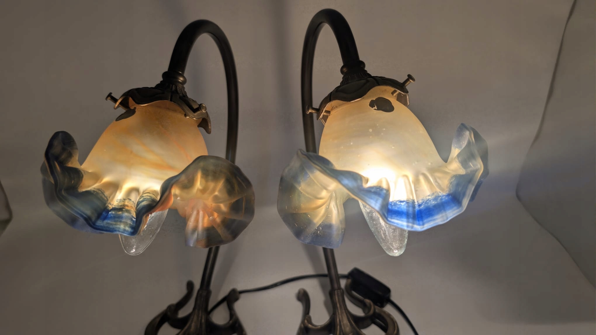 Старовинна французька нічна лампа в стилі модерн з кольоровим вітражним абажуром. Абажур у формі квітки, ймовірно, виготовлений зі скла в стилі Тіффані.